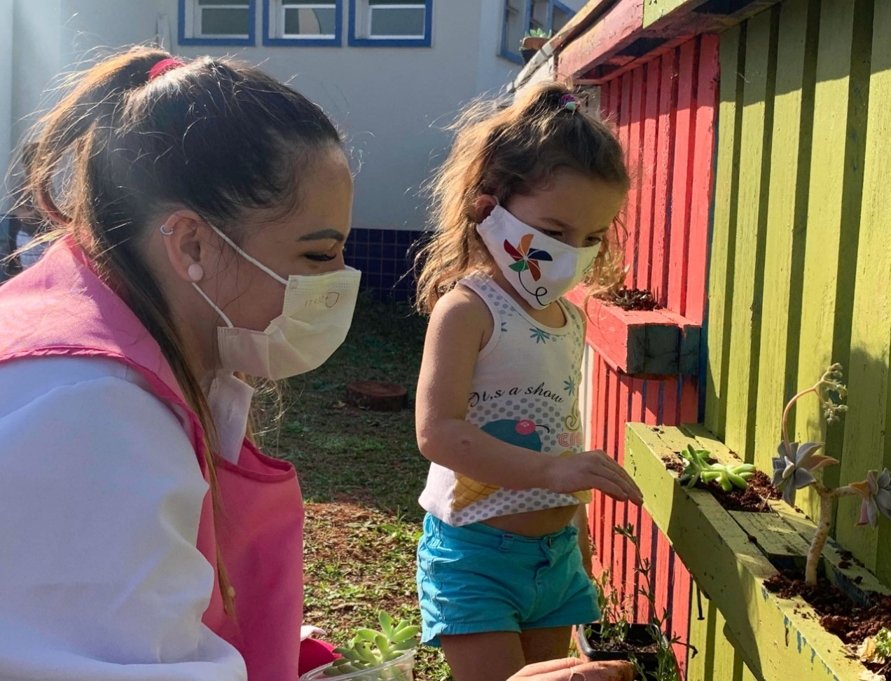 Segundo a aluna Maria Vitória Machado, de três anos, as plantinhas precisam de água, sol e terra para crescerem bonitas.
