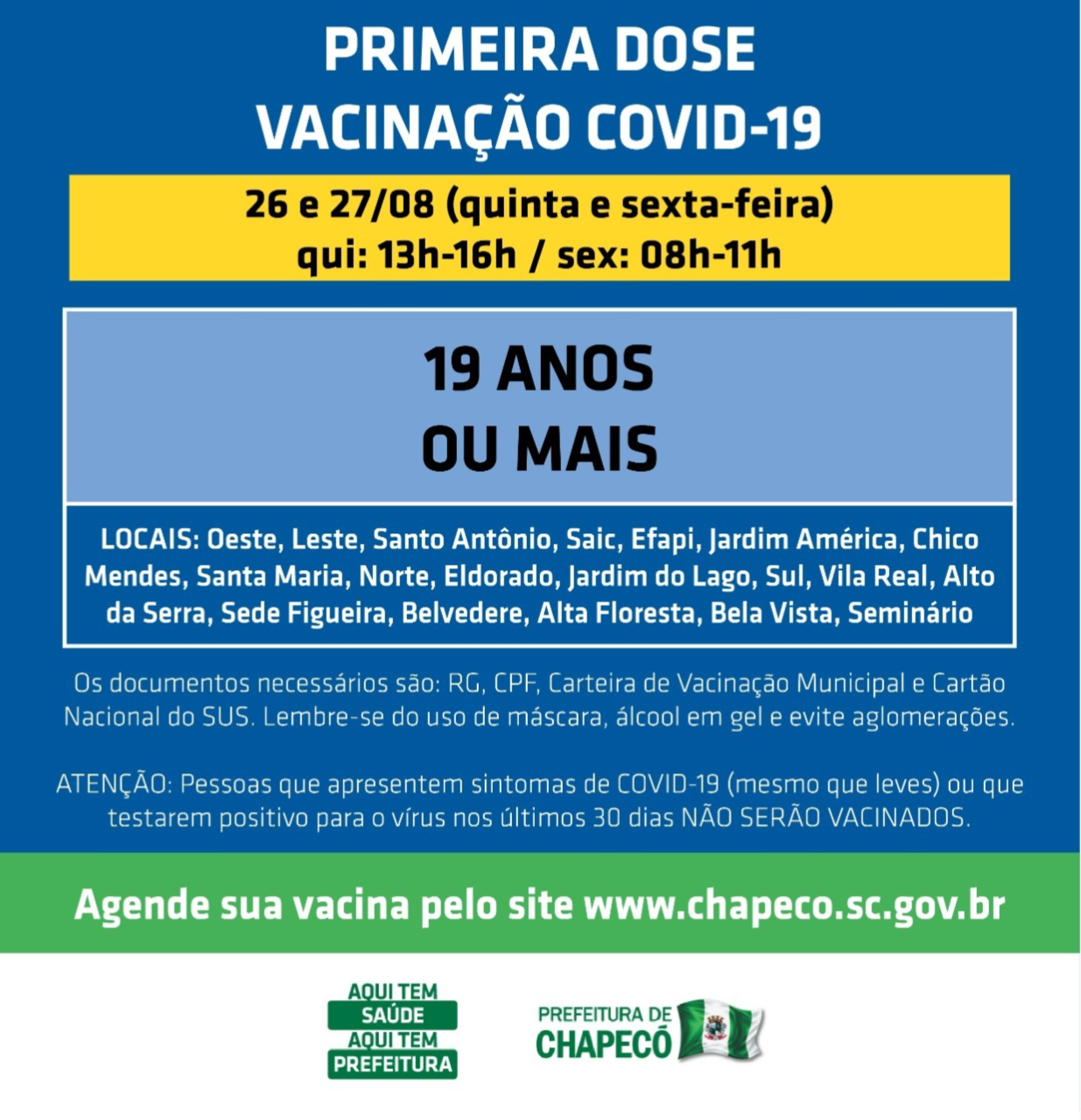 Em ambas as datas, os locais de vacinação permanecem os mesmos. São eles: Oeste, Leste, Santo Antônio, Sair, Efapi, Jardim América, Chico Mendes, Santa Maria, Norte, Eldorado, Jardim do Lago, Sul, Vila Real, Alto da Serra, Sede Figueira, Belvedere, Alta Floresta, Bela Vista e Seminário.