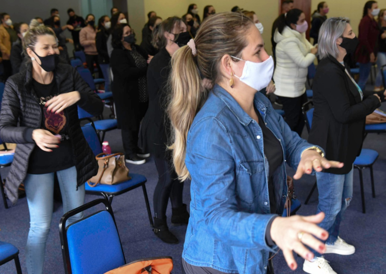 Os coordenadores interagiram nas dinâmicas de grupo conduzidas pela equipe de articuladores da Seduc e na sequência participaram de uma reflexão sobre cuidar do outro e de si, mediada pelas Psicólogas Carolina Faroldi e Suelen Zucco.