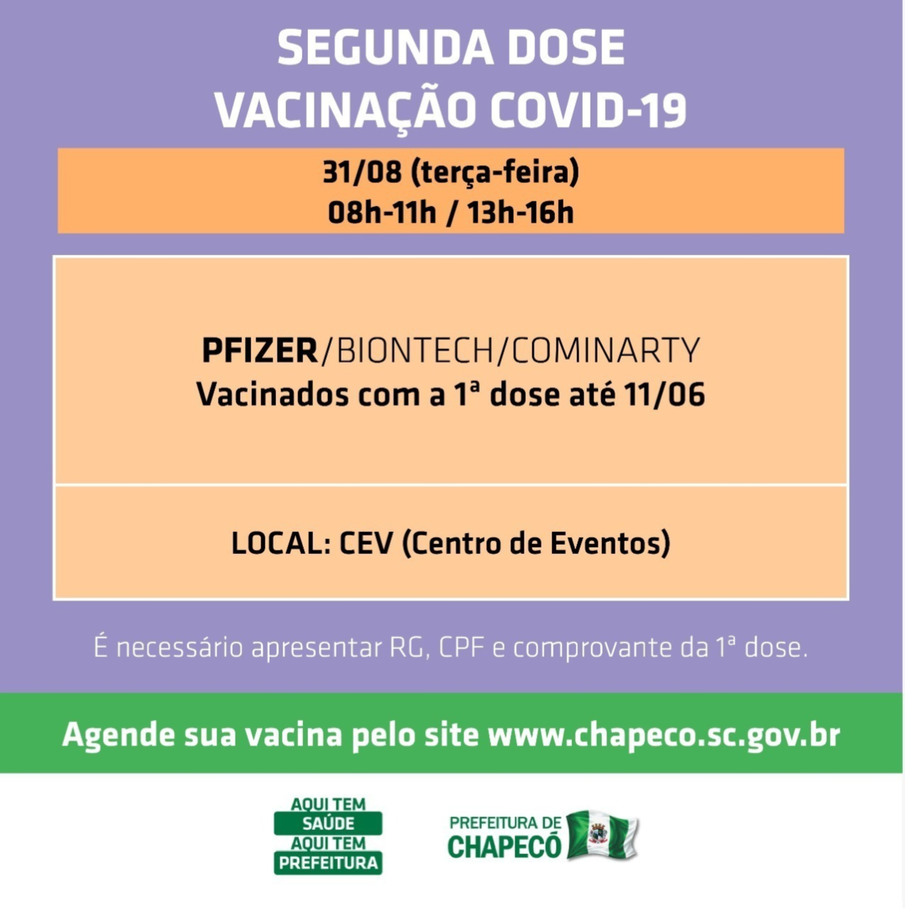 O agendamento deve ser feito no site da Prefeitura (www.chapeco.sc.gov.br). No dia da vacinação é necessário apresentar RG, CPF e comprovante de segunda dose.