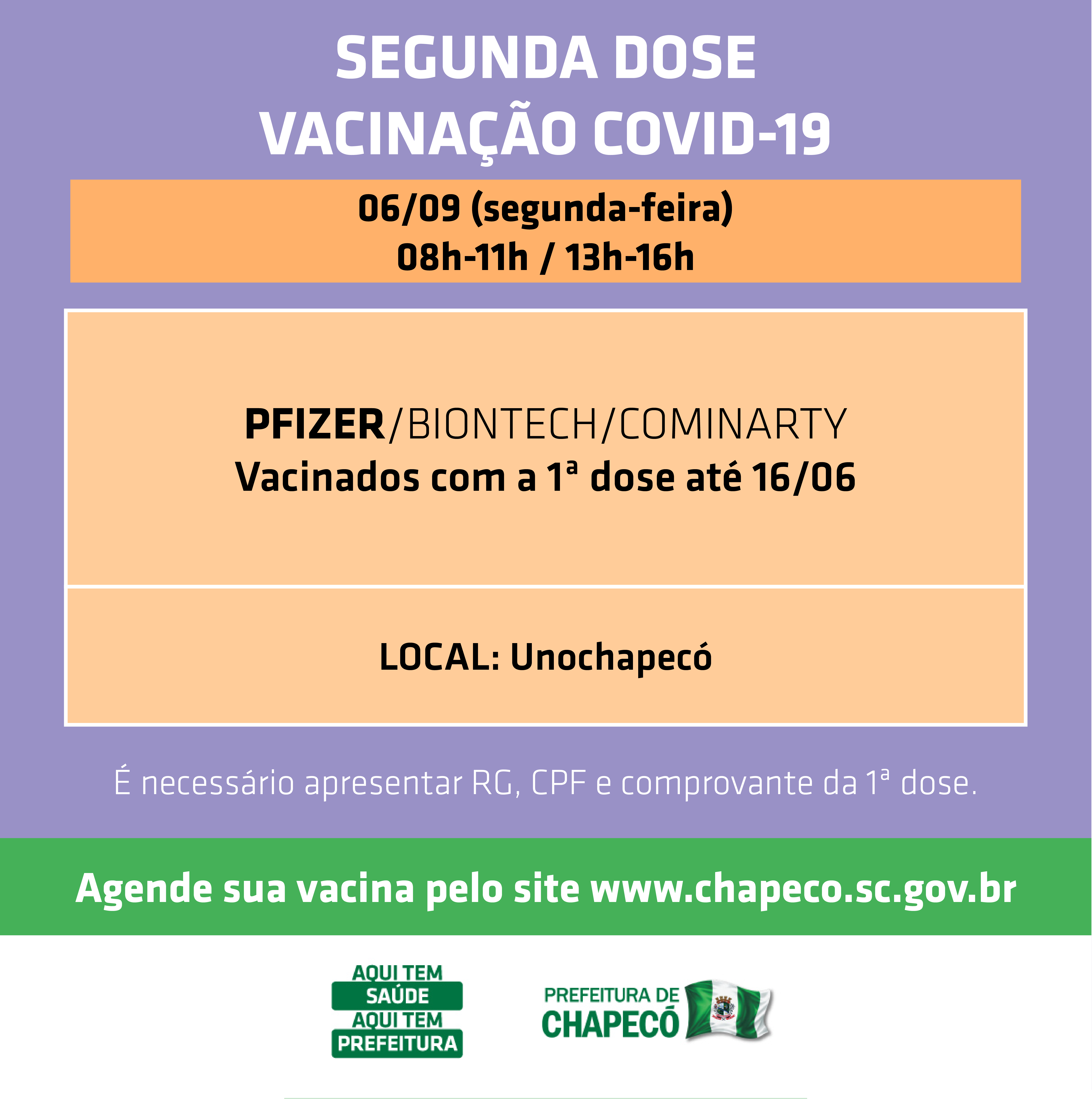 A vacinação ocorrerá na Unochapecó na próxima segunda-feira, 06/09, nos turnos matutino (08h às 11h) e vespertino (13h às 16h30min). As datas de administração da primeira dose que podem agendar a segunda permanecem as mesmas: 16/06 para Pfizer/BioNTech/Cominarty, 02/07 para AstraZeneca/Oxford/Fiocruz/SerumIndia, e 16/08 para Coronavac/Butantan/Sinovac.