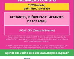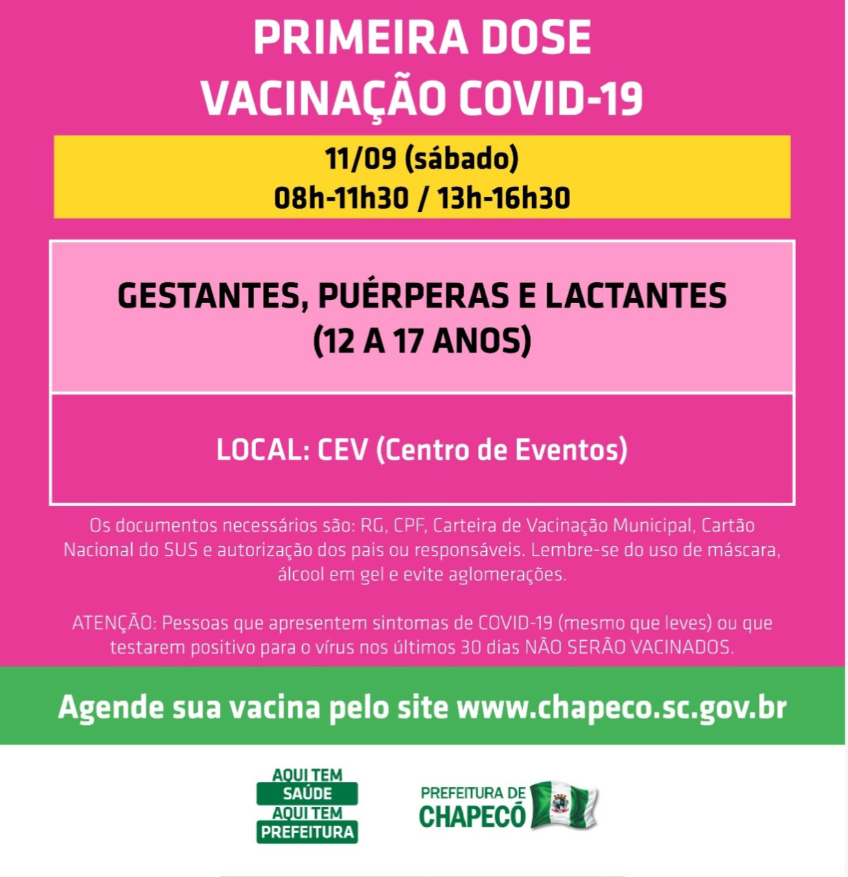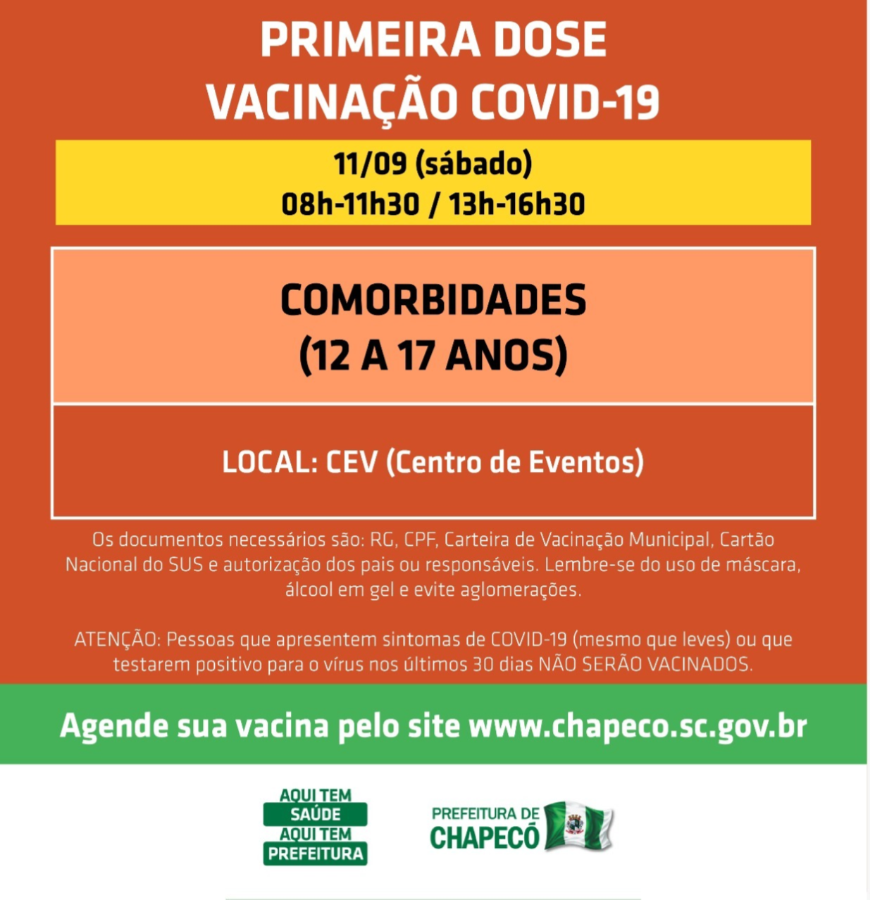A Secretaria de Saúde de Chapecó vai iniciar a vacinação contra a Covid de adolescentes, de 12 a 17 anos, que tenham comorbidades, deficiência ou sejam gestantes, lactantes ou puérperas (até 45 dias depois do parto). A imunização será amanhã, das 8h às 11h30 e das 13h às 16h30, no Centro Estratégico de Vacinação (CEV), que fica no Centro de Eventos.
