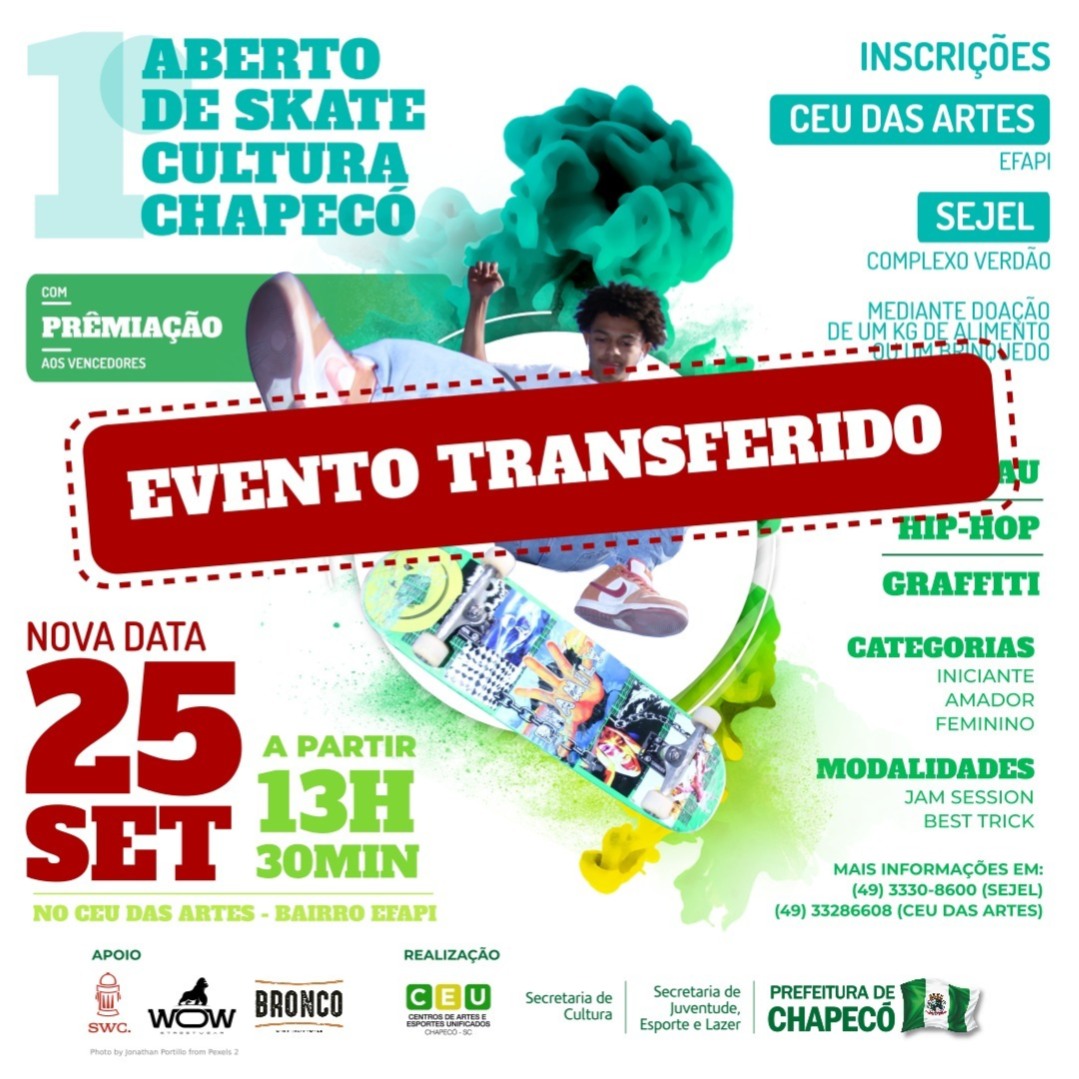 Devido a previsão de chuva para este sábado (18), a Prefeitura de Chapecó, através da Secretaria de Cultura e da Secretaria de Juventude, Esporte e Lazer, decidiu transferir o 1º Aberto de Skate Cultura de Chapecó para o dia 25 de setembro, sábado próximo. O evento ocupará a pista do CEU das Artes, localizado no Loteamento Elias Gallon no Bairro Efapi.