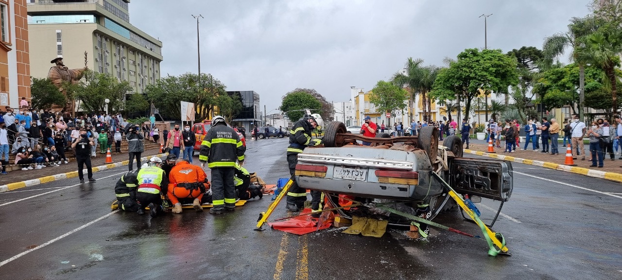 Além do público em geral, que circulava pelas imediações da Praça Coronel Bertaso, o simulado foi acompanhado de perto pelos alunos de 8° e 9° anos das escolas do entorno.