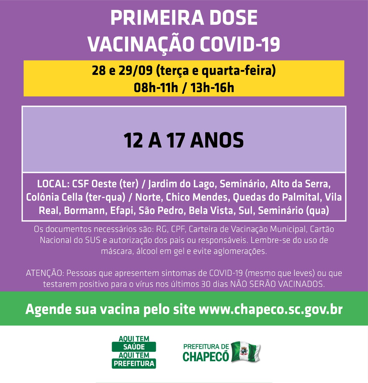 A idade de vacinação para adolescentes em geral baixou para 12 anos completos, indo até 17 anos completos. O agendamento está disponível no site da Prefeitura (www.chapeco.sc.gov.br).