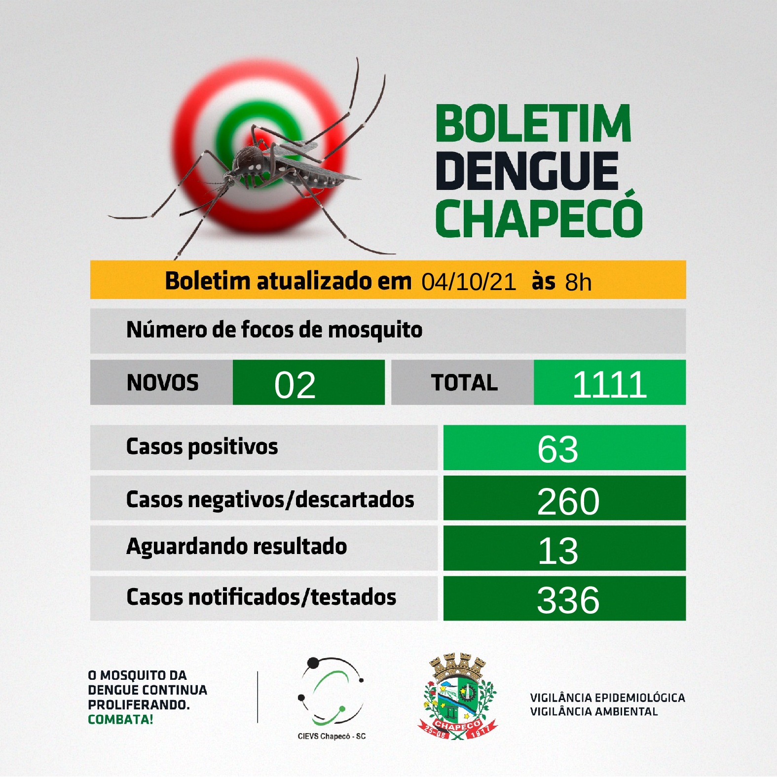 Dois novos focos de foco de mosquito Aedes aegypti registrados na última semana, totalizando 1111 no ano. Temos 63 casos positivos da doença, sendo que 336 foram testados, 260 deram negativo e 13 os que estão aguardando resultado