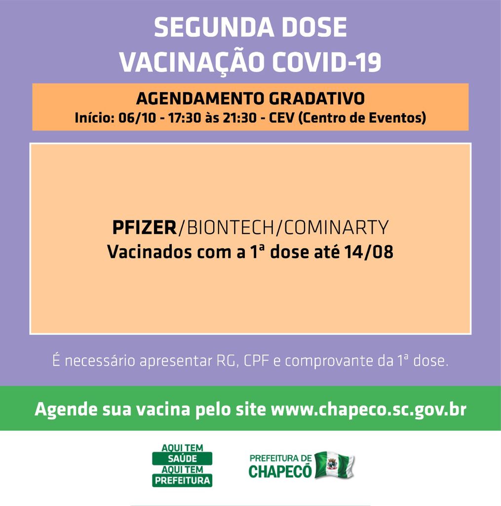 Com a previsão de chegada de mais doses de vacina contra a Covid a Secretaria de Saúde de Chapecó abriu novo agendamento de segunda dose, de hoje (quarta-feira), até sábado.