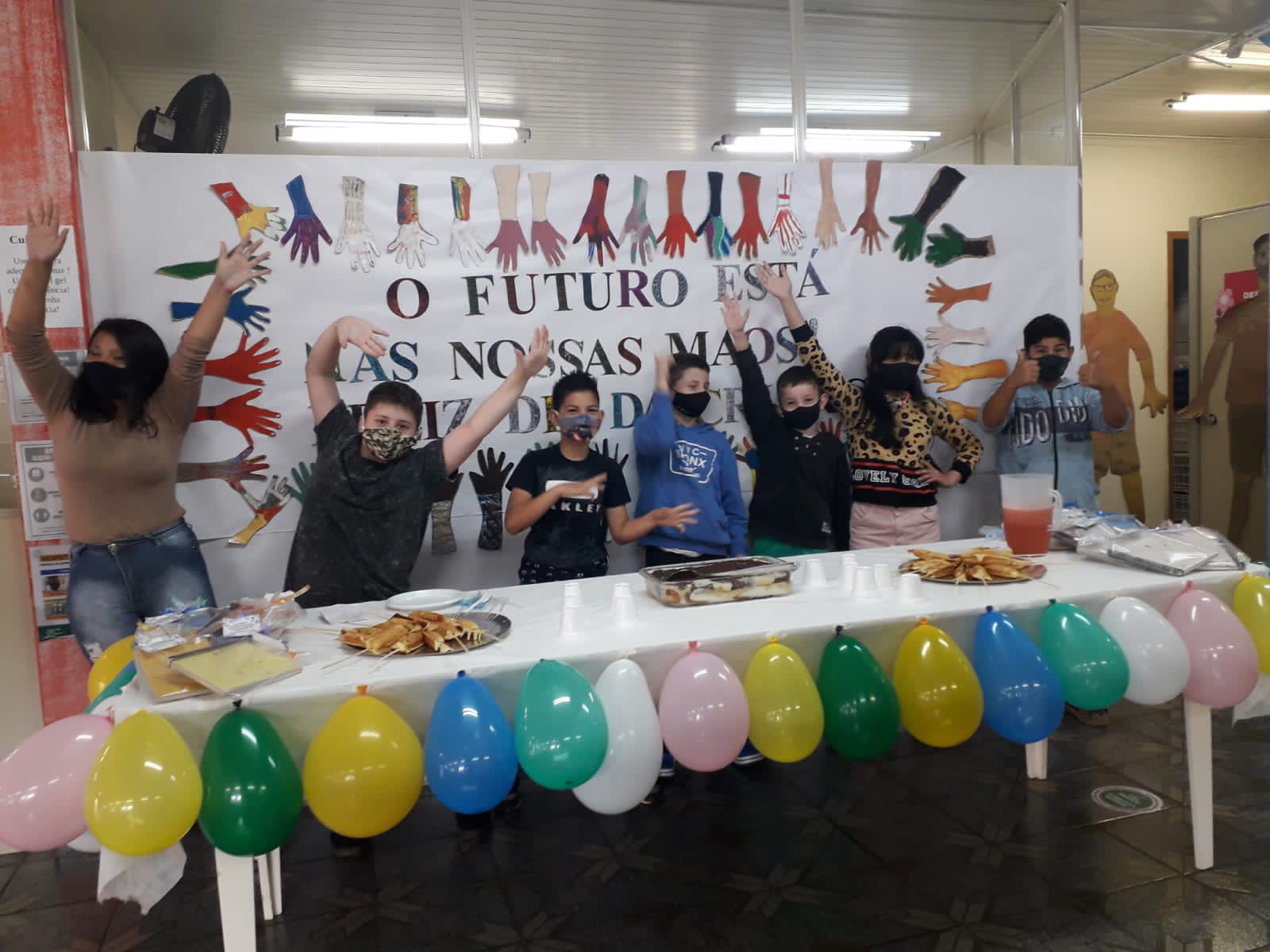 Cada criança e adolescenterecebeu de presente um sketchbook, produzido na Oficina de Papel Reciclado e Cartonagem do Centro de Convivência. Houve um momento de confraternização, com crepes suíço, bolo recheado e suco natural de morango.