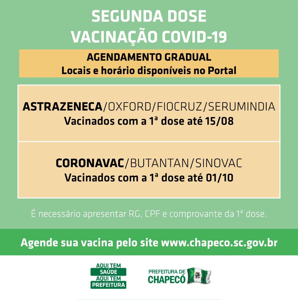 Um novo agendamento de segunda dose foi aberto para sábado, na Unochapecó, das 8h às 11h e das 13h às 16h. Isso para quem tomou Astrazeneca até 15 de agosto, Coronavac até 1º de outubro e Pfizer até 22 de agosto. A Vigilância Epidemiológica informa que, assim que encerrar o agendamento de sábado, será aberto em outro local, para outra data.