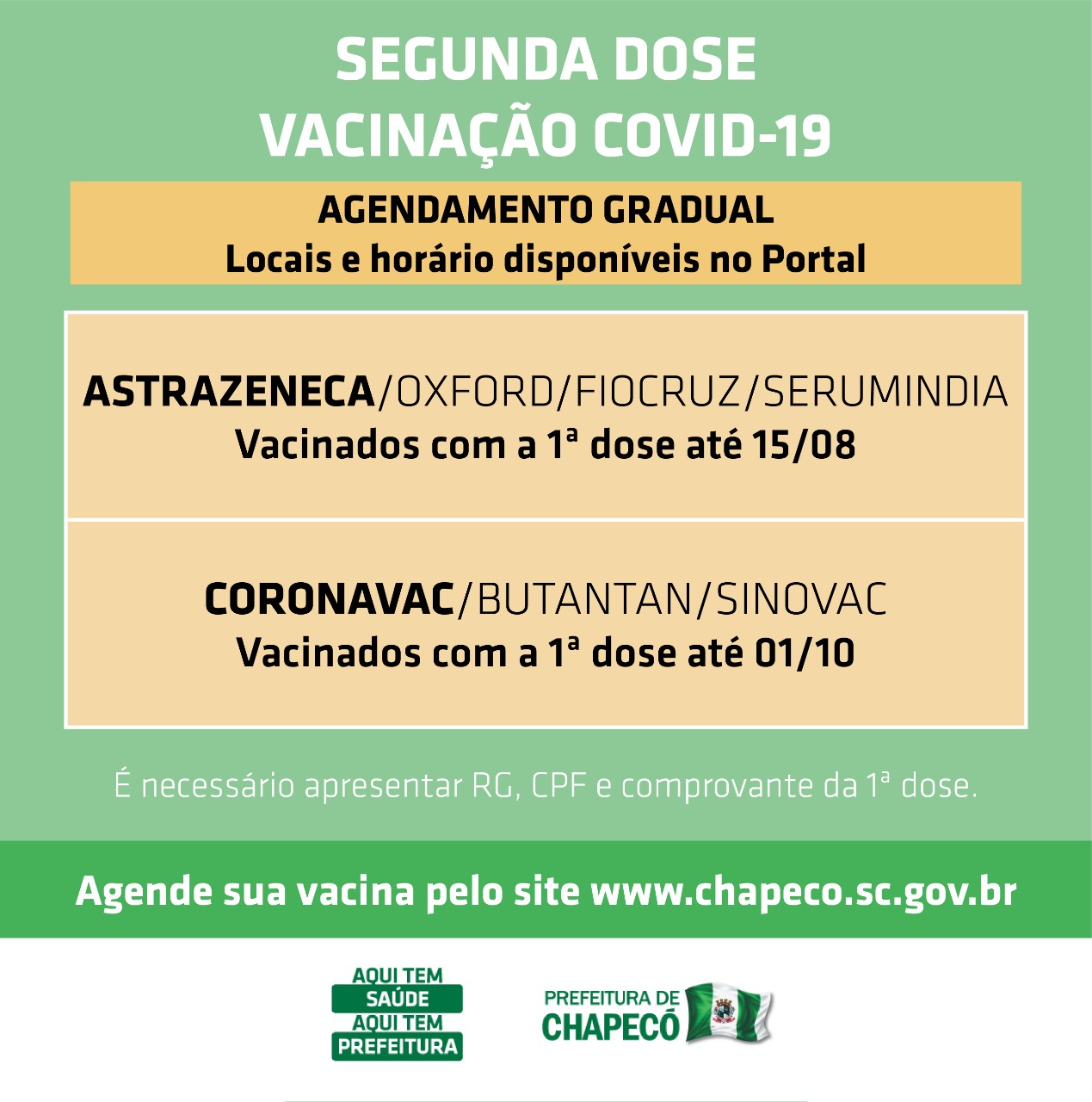 Hoje tem segunda dose mas já está esgotado. Tem vaga disponível para segunda dose, no sábado, na UFFS, das 8h às 11h e das 13h às 16h. O agendamento é pelo site da Prefeitura (www.chapeco.sc.gov.br).