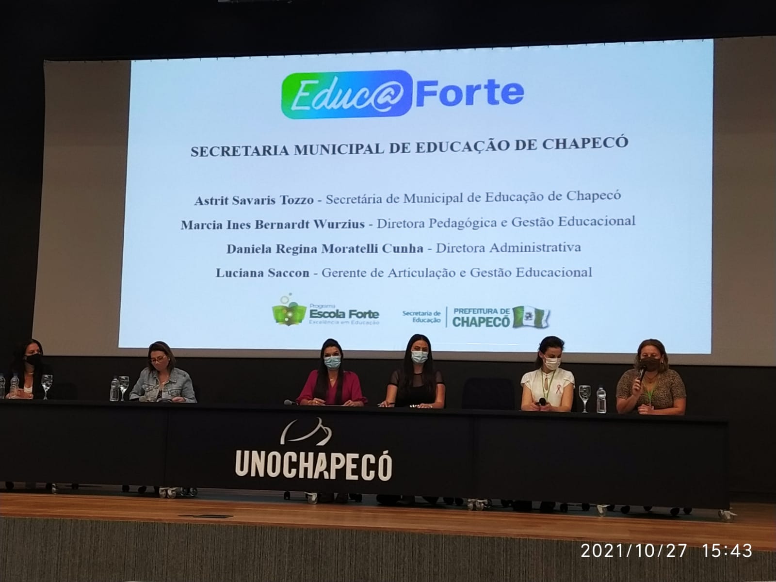 A Secretaria Municipal de Educação também participou com apresentação da experiência, na tarde do dia 27, através do setor de Articulação e Gestão Educacional, com o relato do Projeto Gestão Itinerante: um projeto inovador, apresentado pela Gerente de Articulação e Gestão Educacional, Luciana Saccon, e pela Articuladora de Articulação e Gestão Educacional, Celina Eliane Frizzo.