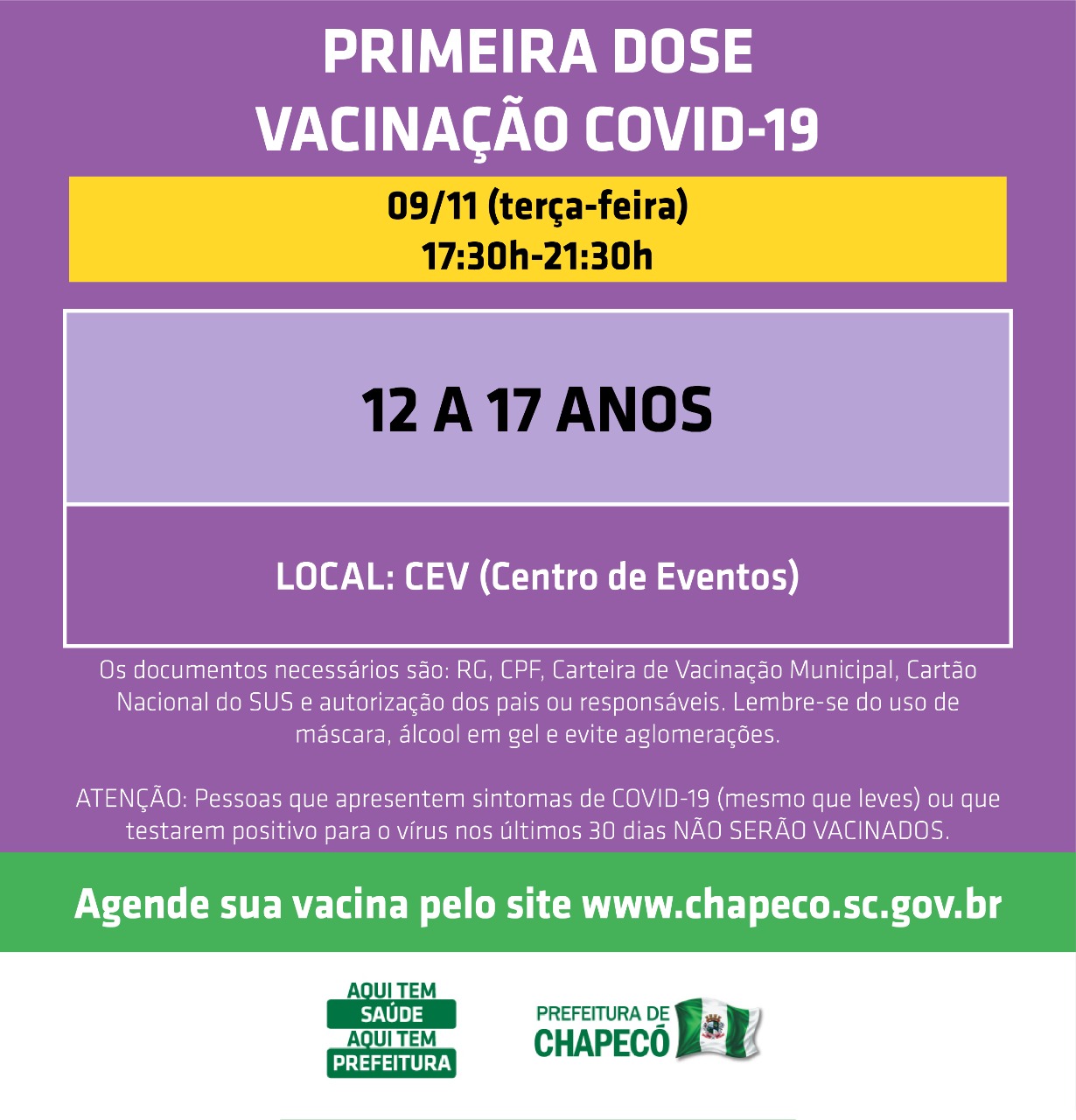 Está disponível novamente o agendamento para adolescentes que ainda não tomaram a primeira dose da vacina contra a Covid-19, no site da Prefeitura (www.chapeco.sc.gov.br).