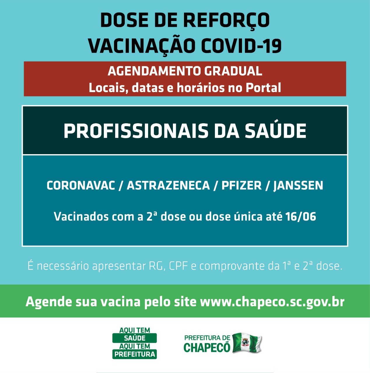 Nesta terça-feira abriu agendamento de reforço para profissionais de saúde, que tomaram a segunda dose até 16 de junho. A vacinação será na quarta, quinta e sexta-feira, das 8h às 11h e das 13h às 16h, na unidade de saúde Chico Mendes.