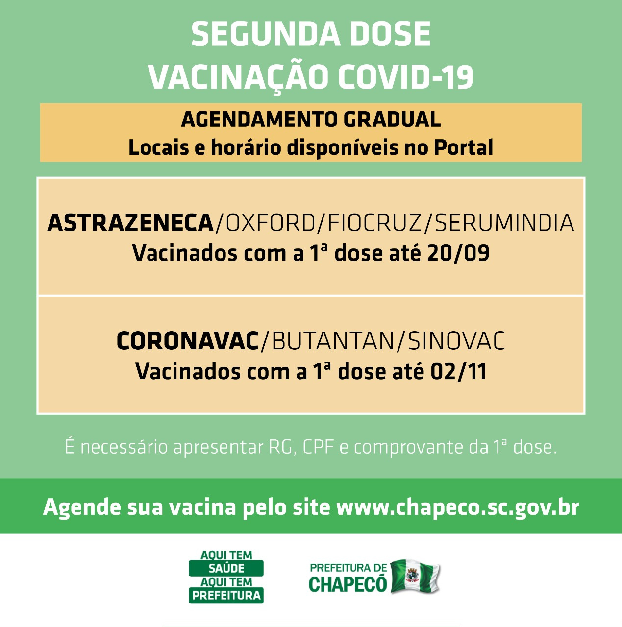 Está disponível o agendamento de segunda dose para quinta-feira, no Centro Estratégico de Vacinação, que fica no Centro de Cultura e Eventos. Mudou a data da Coronavac, que agora é para quem tomou segunda dose até 2 de novembro. A data da Pfizer é 4 de outubro e, Astrazeneca, até 20 de setembro. Horários no site pois restam poucas vagas. Mas a abertura é gradativa.