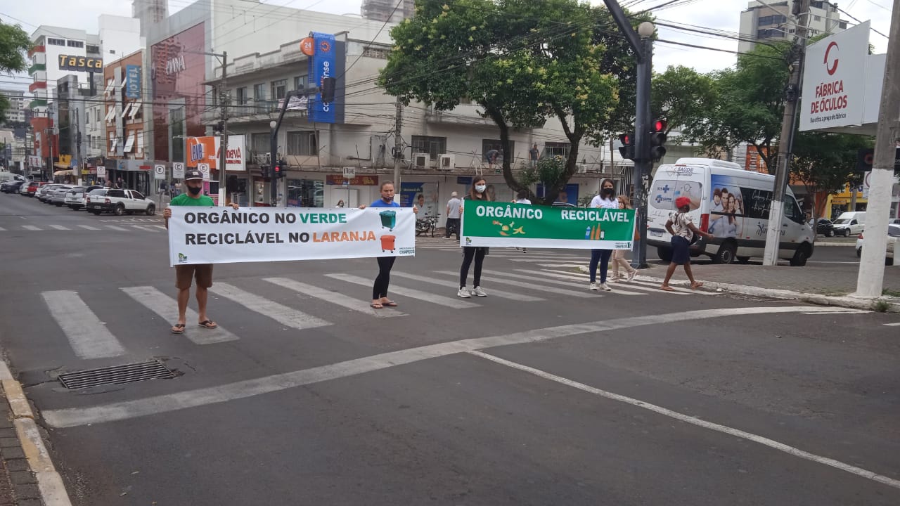 A ação foi na Avenida Getúlio Vargas, com faixas e abordagens aos motoristas e pedestres, ressaltando que o resíduo seco deve ser colocado no contêiner laranja e, o orgânico no contêiner verde.