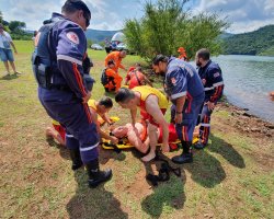Uma simulação de resgate em acidente com embarcação, onde teria ocorrido uma explosão e pessoas teriam se jogado na água, algumas sem colete e sem saber nadar, foi realizada na manhã desta quinta-feira, no rio Uruguai, no Goio-Ên.