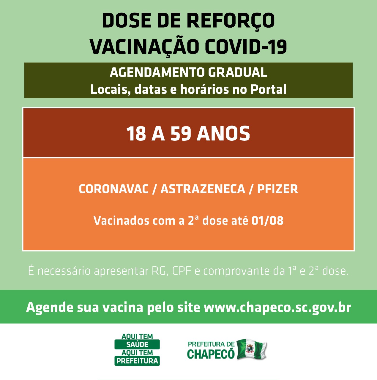 A Secretaria de Saúde de Chapecó anunciou a alteração do intervalo para a dose de reforço de 18 anos a 59 anos e também dos idosos, que passou de 22 de julho pra 1º de agosto, a data limite de segunda dose. Ou seja, quem tomou segunda dose até esta data pode buscar a vacina, seja com agendamento no site da Prefeitura (www.chapeco.sc.gov.br), seja sem agendamento, neste sábado, na UFFS.