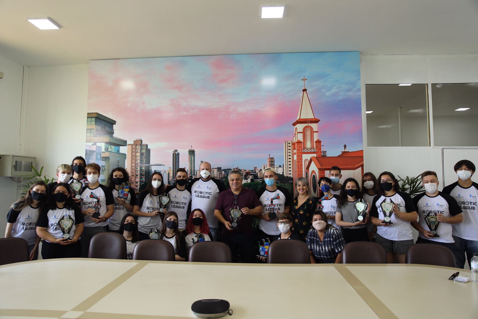 Na manhã desta quarta-feira o prefeito de Chapecó, João Rodrigues, recebeu na sala de reuniões da prefeitura a equipe de Robótica da E.E.B Bom Pastor, que foi campeã nacional em 2019 e campeão mundial em 2021. Na semana passada a equipe esteve no Torneio Juvenil de Robótica em São Paulo, de onde trouxe troféus, medalhas e vaga para o International Torunamente of Robots 2022, em Tampico, no México.
