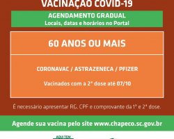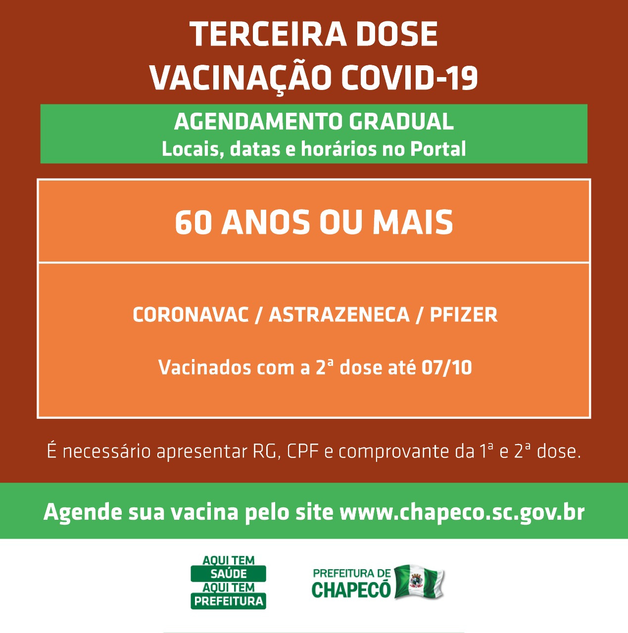 A Secretaria de Saúde de Chapecó alterou nesta semana a data limite do reforço de vacina para a Covid-19. A terceira dose agora está disponível para quem tomou a segunda dose até 7 de outubro. No caso dos imunossuprimidos a data é 1º de janeiro.