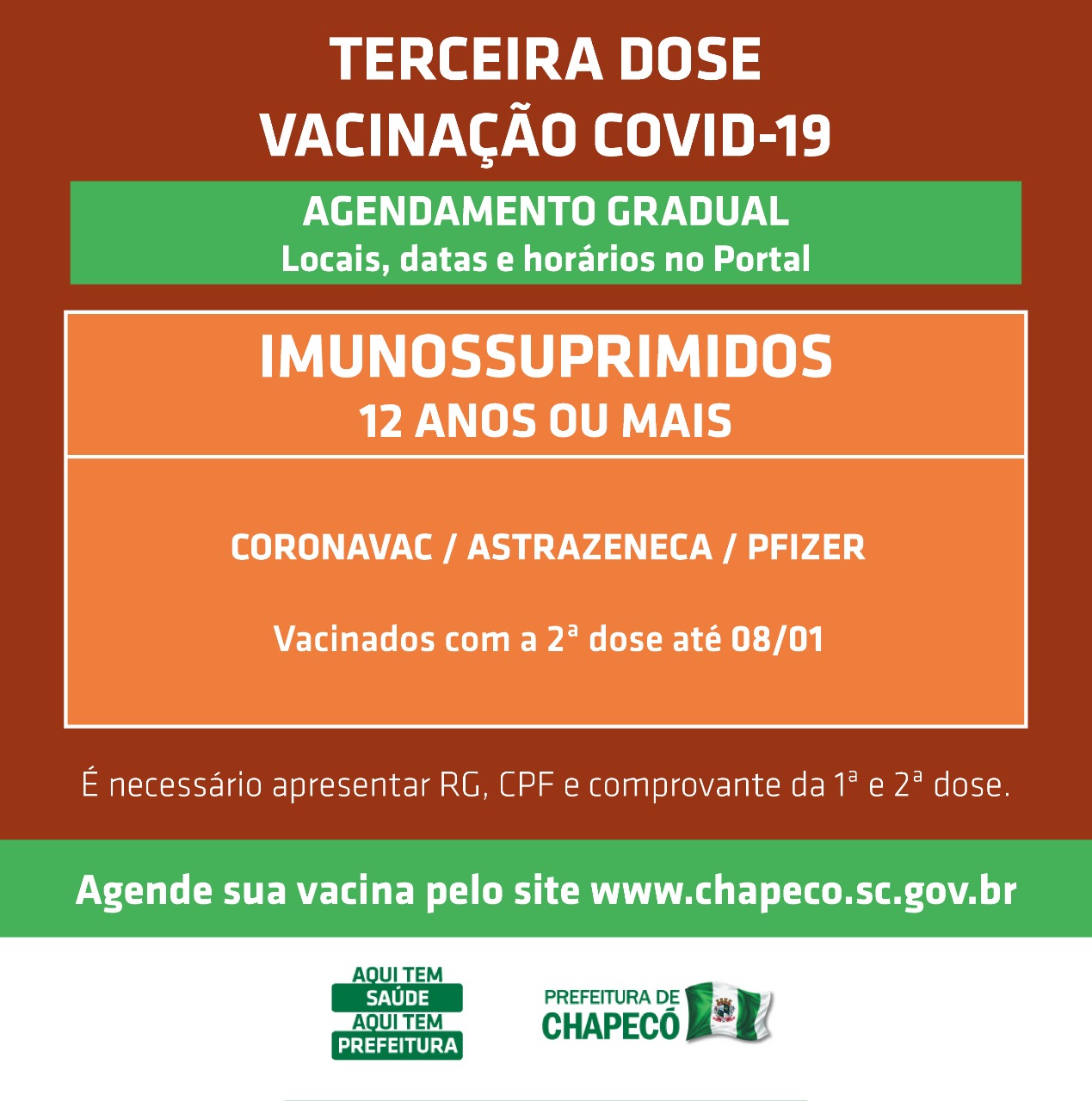 Após liberação do Ministério da Saúde a Vigilância em Saúde de Chapecó abriu agendamento para dose de reforço destinada a adolescentes com imunocomprometimento. Estão enquadradas neste grupo quem tem doenças como lúpus, artrite reumatoide, doença de Crohn, anemia hemolítica, entre outras, além de pessoas transplantadas. O reforço será feito com Pfizer.