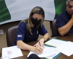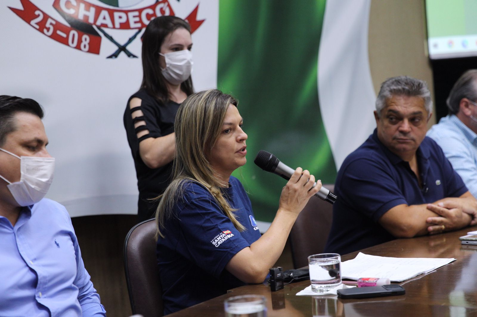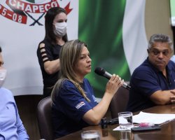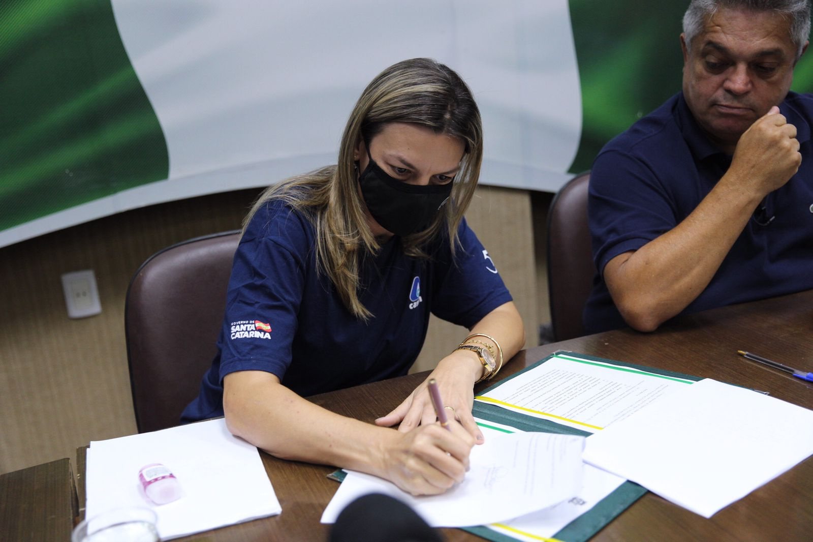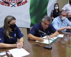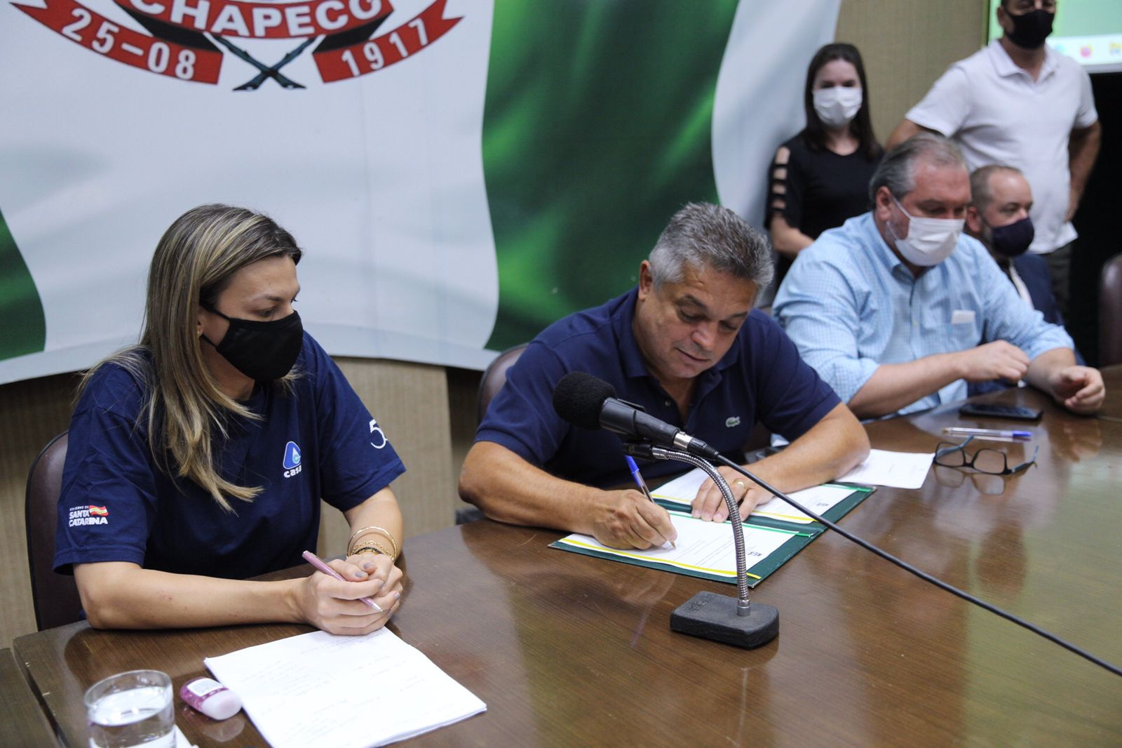 Um termo de compromisso foi assinado na manhã desta quinta-feira, no auditório da Prefeitura, pelo prefeito de Chapecó, João Rodrigues, e pela presidente da Casan, Roberta Mass dos Anjos. Antes da assinatura o prefeito fez uma reunião com o vice-prefeito, Itamar Agnoletto, o presidente da Câmara de Vereadores, Adão Teodoro, demais vereadores, o presidente da CDL, Clóvis Spohr, presidente da ACIC, Lenoir Broch, o presidente do Sicom, Ernani Zottis, o corrdenador municipal da Defesa Civil, Valter Luciano Hüning, o diretor geral da Agência Reguladora de Saneamento (ARIS), Adir Faccio, o superintendente da Casan no Oeste, Daniel Scharf, o Procurador Geral do Município, Jauro Von Gehlen, o secretário de Governo, Thiago Felipe Etges, além de outros secretários e autoridades, além da primeira dama Fabiana Rodrigues, que fornecerá água do açude da família para atendimento da população.