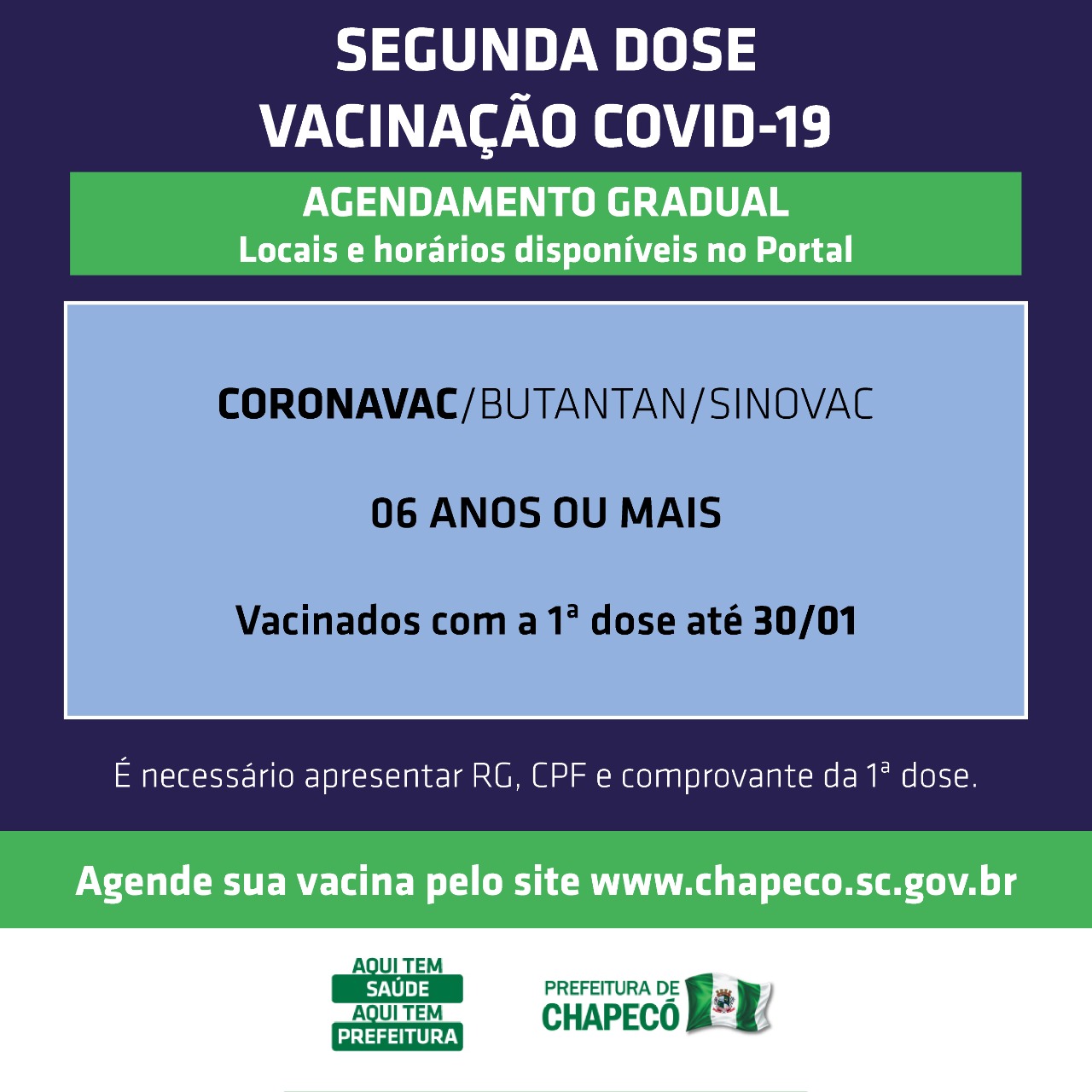 Na manhã desta segunda-feira (21/02), a equipe de Vigilância Epidemiológica iniciou o agendamento para a vacinação com a segunda dose da vacina contra a Covid-19 da marca Coronavac em crianças de 06 anos ou mais. Esta pode ser agendada para todas as crianças desta faixa etária que tenham tomado a primeira dose até, no máximo, 30/01.