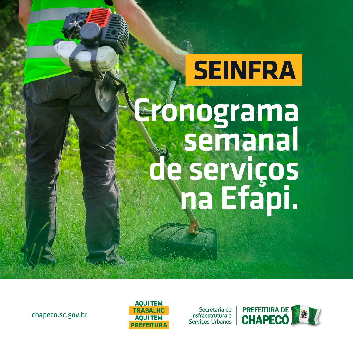 A Superintendência da Efapi informa o cronograma de atividades previstas para esta semana, de quarta até sexta-feira. Informamos que o cronograma poderá sofrer alterações devido às condições climáticas.
