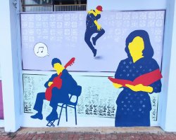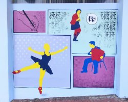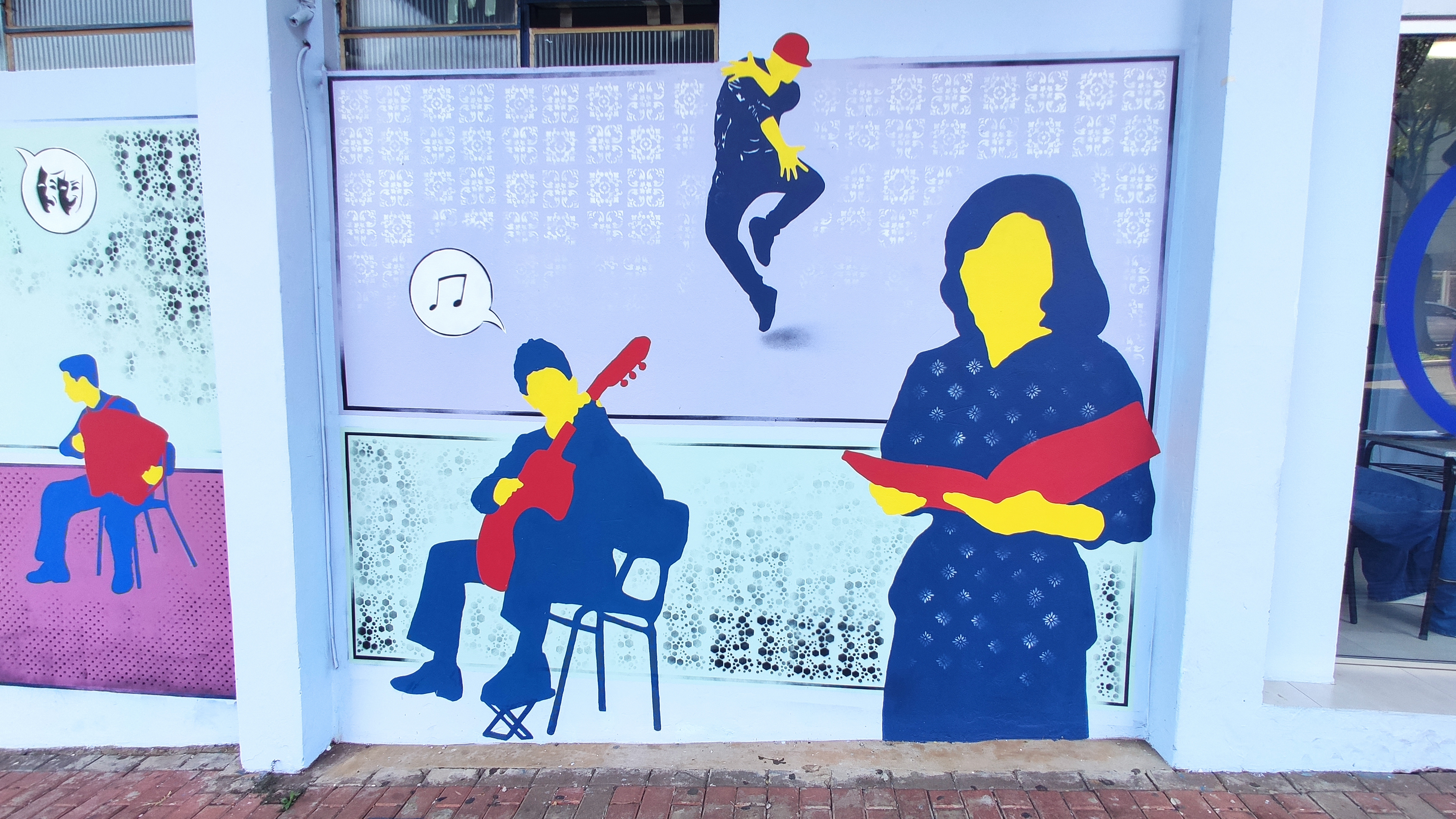 Sidimar Geremia, professor que coordenou a elaboração, explica que o objetivo era resgatar momentos da história da Escola e compô-los com as artes ensinadas, além de englobar tudo com outras iniciativas desenvolvidas pelo espaço. A parte realizada pelo Digo traz o ano de fundação da Escola (1979). Seguindo o mural, temos a representação da cerimônia de inauguração e, a partir disso, todas as linguagens artísticas que são ensinadas, principalmente os primeiros cursos, que foram: violão, balé e desenho.
