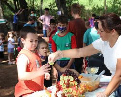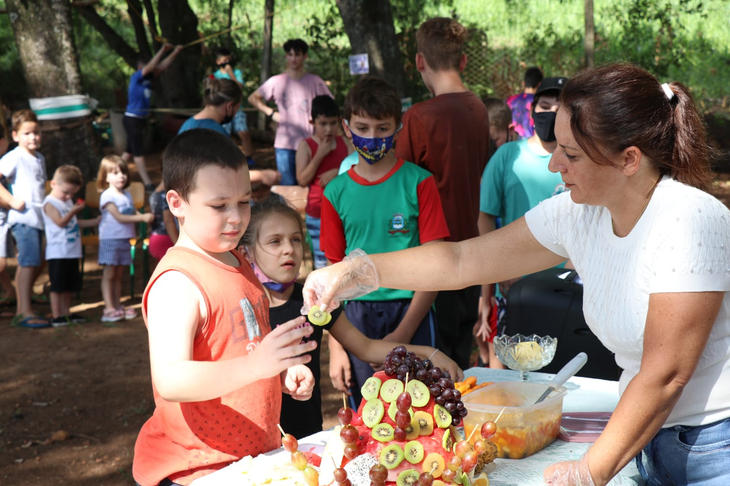 A gestão da escola também buscou doações e adquiriu mais frutas para que o momento se tornasse ainda mais atrativo e divertido. As frutas foram higienizadas e organizadas pela servidora responsável pelo lanche da instituição que não mediu esforços para deixar o bolo bonito e saboroso.