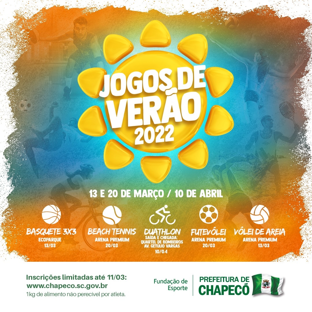 Neste domingo tem os Jogos de Verão 2022, uma promoção de Fundação de Esporte de Chapecó. Na Arena Premium, localizada na rua Nereu Ramos 3246 E, bairro Líder, acontece a competição de vôlei de praia masculino e feminino, a partir das 8h. São 32 duplas inscritas.