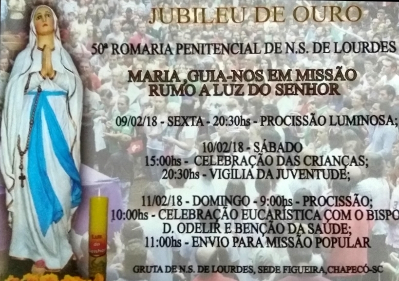 A Comunidade de Sede Figueira promove, neste fim de semana, a 50ª Romaria Penitencial de Nossa Senhora de Lourdes, na Gruta de Sede Figueira. A Procissão Luminosa está programada para esta sexta-feira, 09/02, a partir das 20h30min, mas as festividades continuam no sábado e no domingo. No sábado, 15h, a celebração reúne as crianças da comunidade e segue à noite, 20h30min, com a Vigília da Juventude. No domingo, 11, acontece a procissão, a partir das 9h, seguida da celebração com o Bispo Diocesano, Dom Odelir José Magri, com a tradicional Bênção da Saúde.