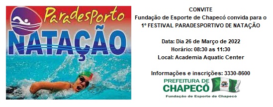 O 1º Festival Paradesportivo de Natação será realizado no próximo sábado, das 8h30 às 11h30, na Academia Aquatic Center, numa promoção da Fundação de Esporte de Chapecó. As inscrições estão abertas até quinta-feira e podem ser feitas pelo telefone 49-3330-8600, que também serve para outras informações.