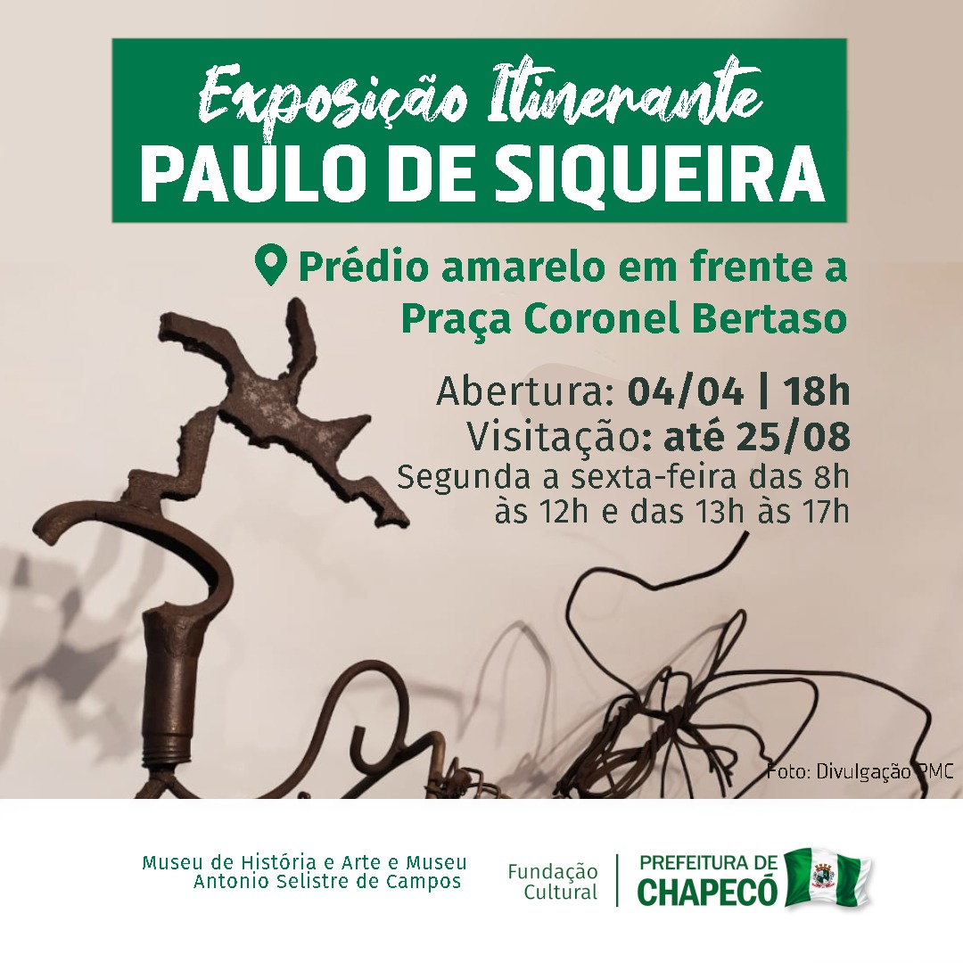 A Fundação Cultural de Chapecó, através da Gerência de Patrimônio e Cultura, realiza a Exposição Paulo de Siqueira. A exibição contará com as obras que pertencem ao acervo do Memorial Paulo de Siqueira. A exposição será aberta ao público no dia 4 de abril, às 18h, no Museu de História e Arte de Chapecó, e receberá visitantes até 25 de agosto, data do aniversário do município.