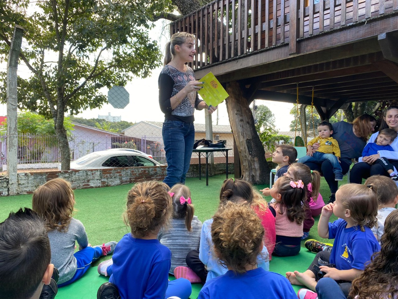 No dia 19 de abril, as crianças receberam uma visita muito especial da escritora Eliziane Nicolao, natural de Chapecó, que tem 8 livros publicados e mais diversas participações em antologias. É professora de leitura mediada, contadora de histórias e agente literária. Professora Lizi contou a história: Festa, livro de sua autoria.