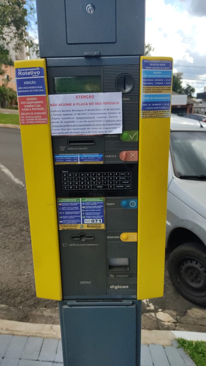 A Administração Municipal de Chapecó informa que o sistema de Estacionamento Rotativo está suspenso, por encerramento de contrato com a empresa que prestava serviços, o que ocorreu no dia 30 de abril de 2022.