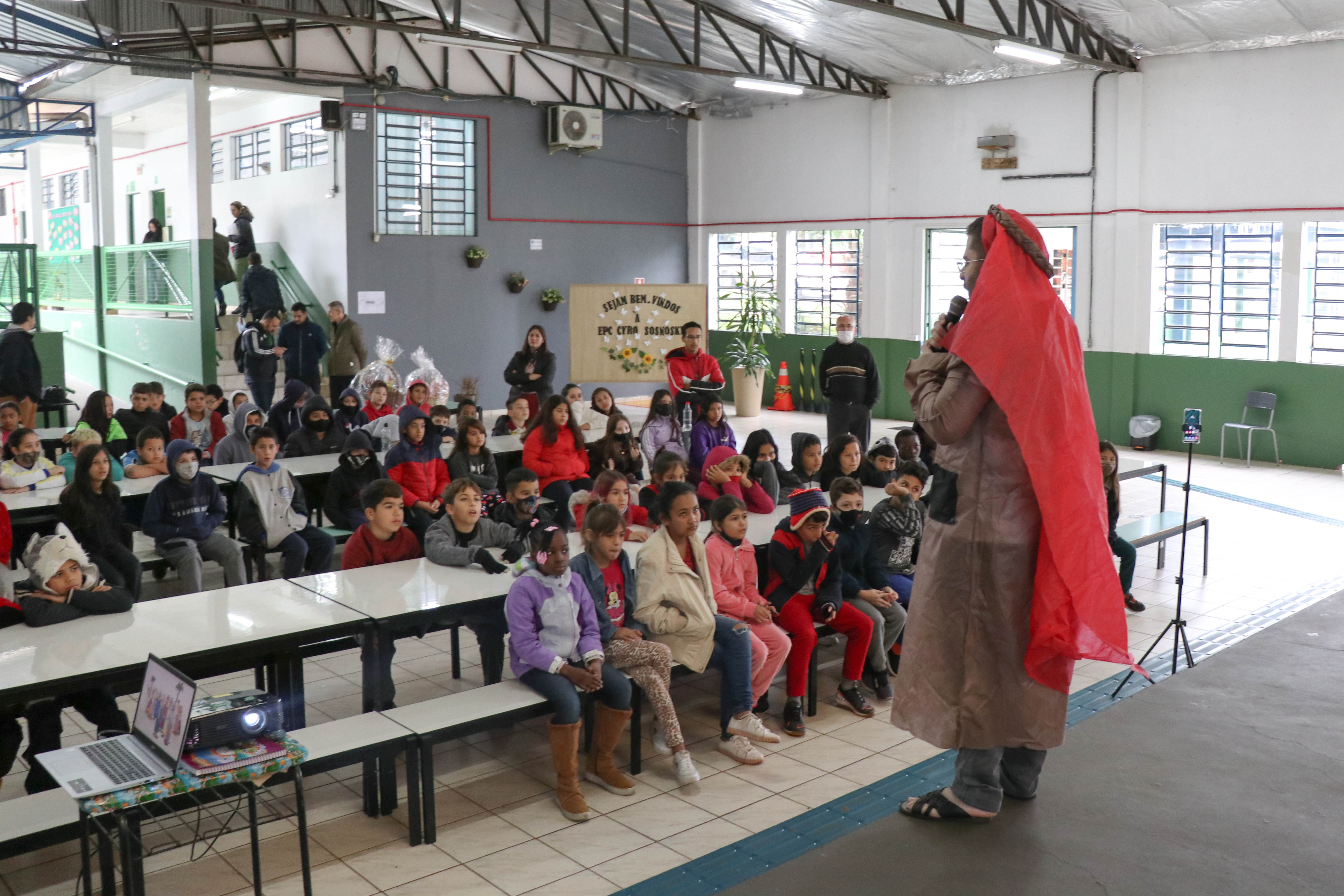 Para esse dia, a EPC Cyro Sosnosky preparou uma apresentação de teatro com o conto Os trinta e cinco camelos presente na sua principal obra. O momento foi pela diversão e conhecimento, unindo literatura, matemática e cultura. Participaram dessa atividade aproximadamente 300 estudantes do 4º ao 9º ano. Através da interpretação da obra e de forma divertida, conseguimos trabalhar temas que os estudantes têm dificuldades para compreender tornando um complemento do que eles aprendem em sala de aula, destacou Marco Antônio Vieira, professor de matemática e contador da história.