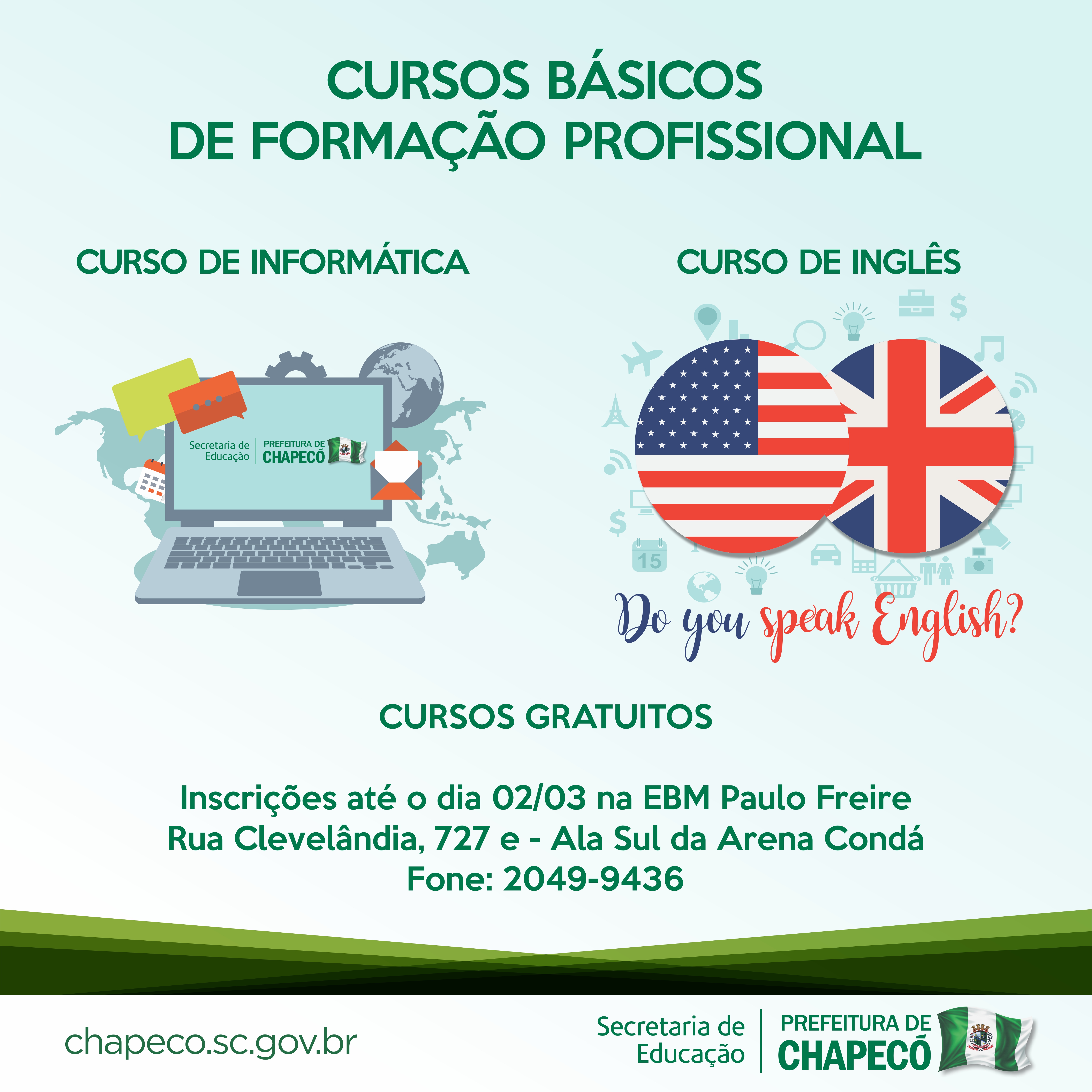 Com o objetivo de contribuir com a qualificação e formação pessoal e profissional para o exercício da cidadania, a Administração Municipal, por meio da Secretaria Municipal de Educação e da Escola Básica Municipal Paulo Freire oferece Cursos Básicos de Formação Profissional. As inscrições para os cursos de Informática Básica e Língua Inglesa em nível iniciante e intermediário, iniciariam na segunda-feira (26).