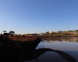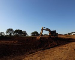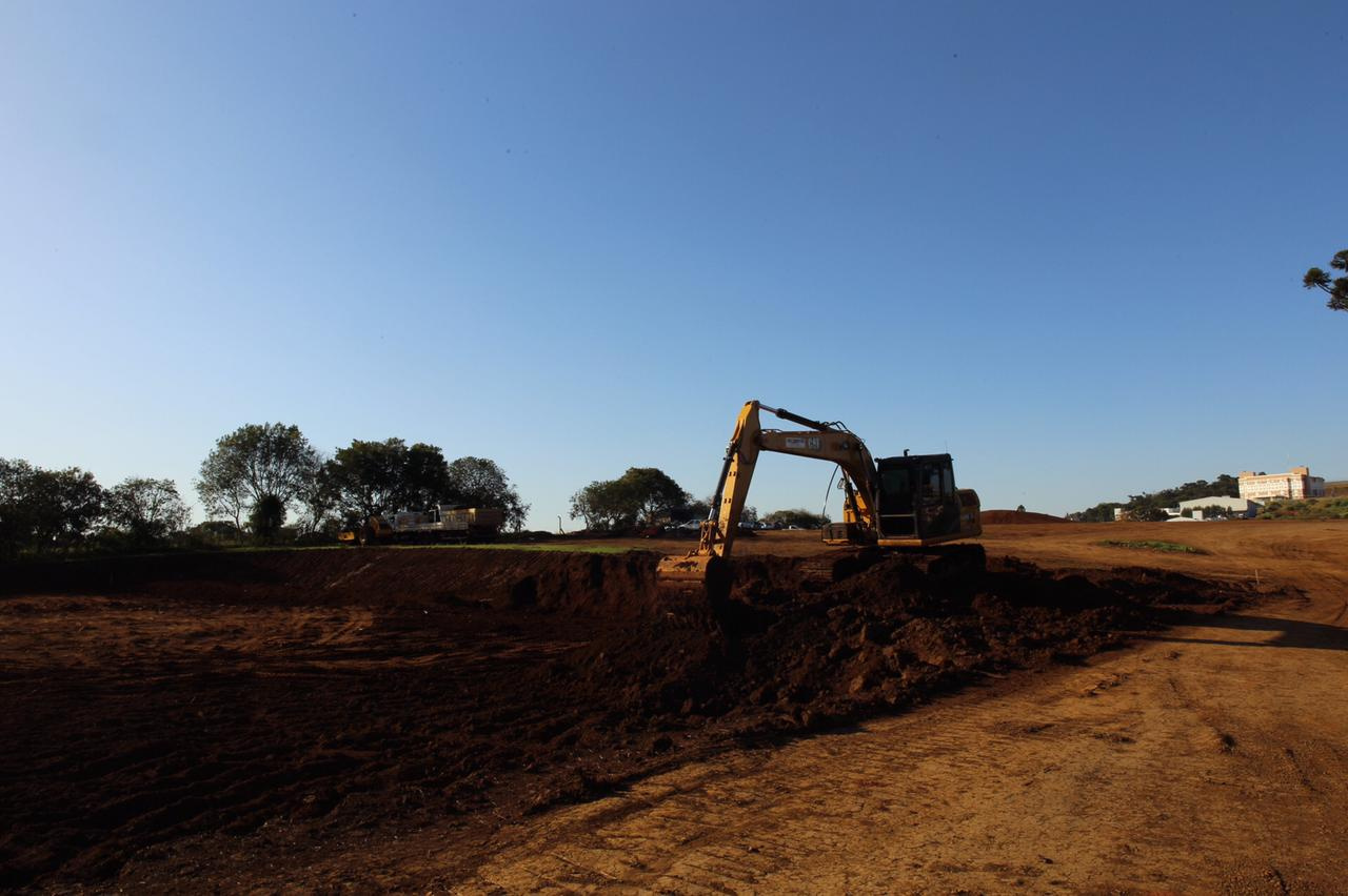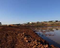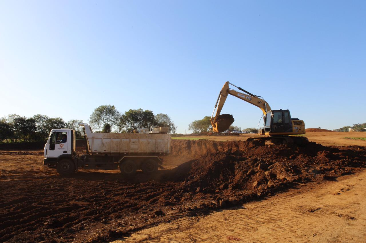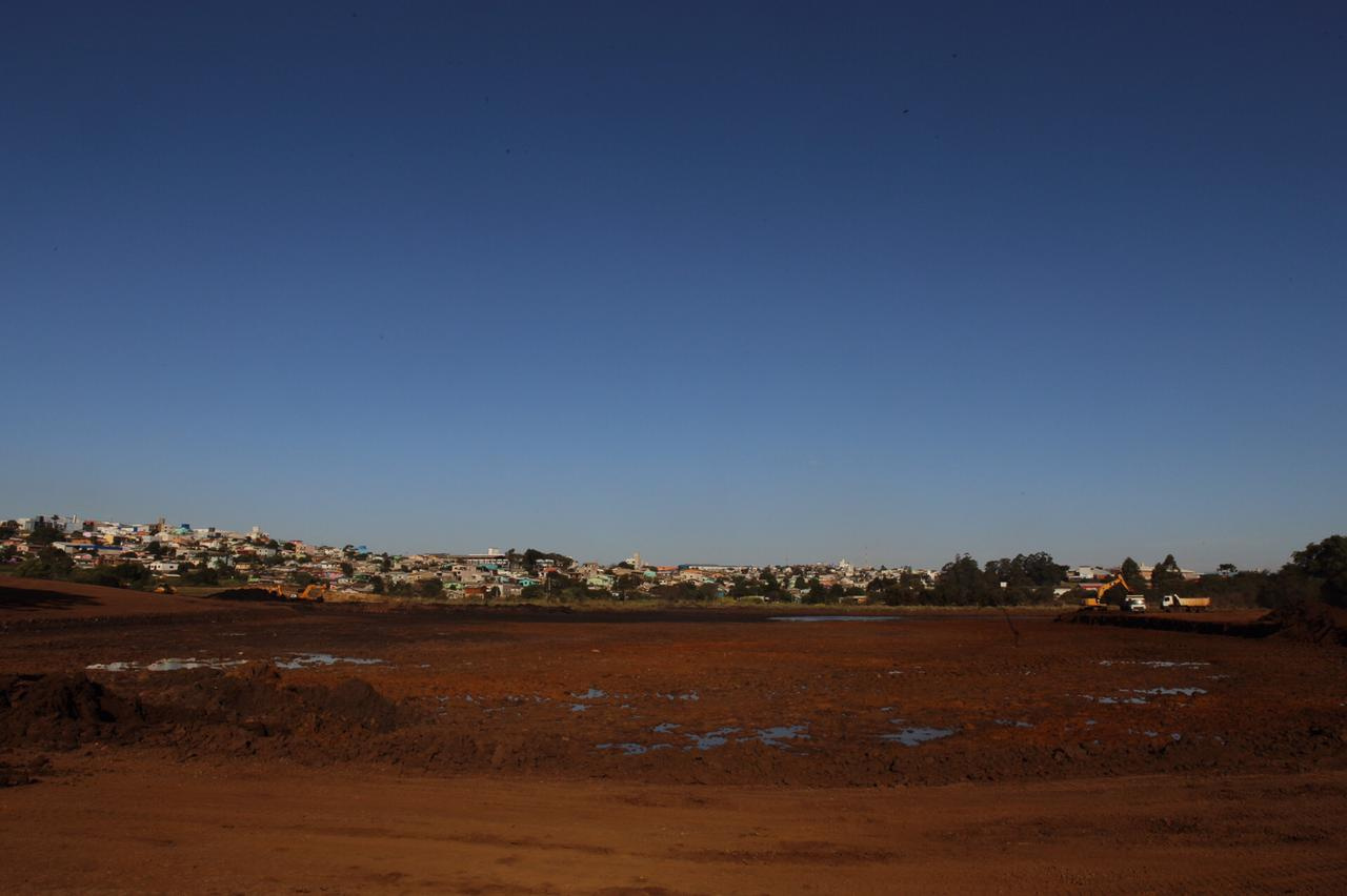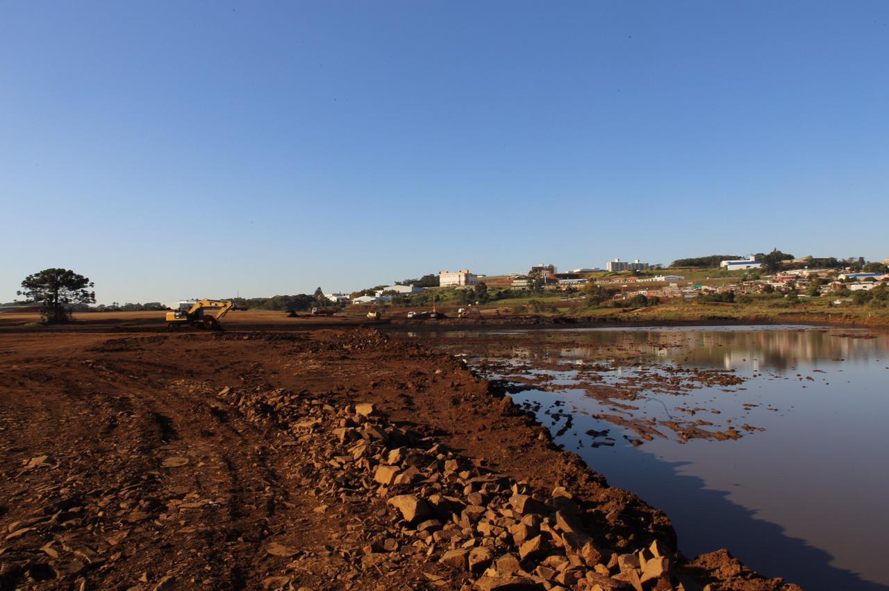 O movimento de caminhões e máquinas estava intenso na tarde desta quarta-feira, na baixada do bairro Eldorado e parte do bairro Água Santa. Eram 27 caminhões, sete escavadeiras, quatro tratores de esteira e três rolos compactadores funcionando. É que lá está sendo construído o lago do Parque do Eldorado. O parque terá 200 mil metros quadrados e, o lago, 50 mil metros quadrados de lâmina de água. Mas de volume, serão 85 mil metros cúbicos, que servirão de reserva para períodos de estiagem. De acordo com o secretário de Infraestrutura Urbana, Luiz Paulo Carraro, serão construídas comportas de alvenaria, para que a água seja liberada quando for necessário.