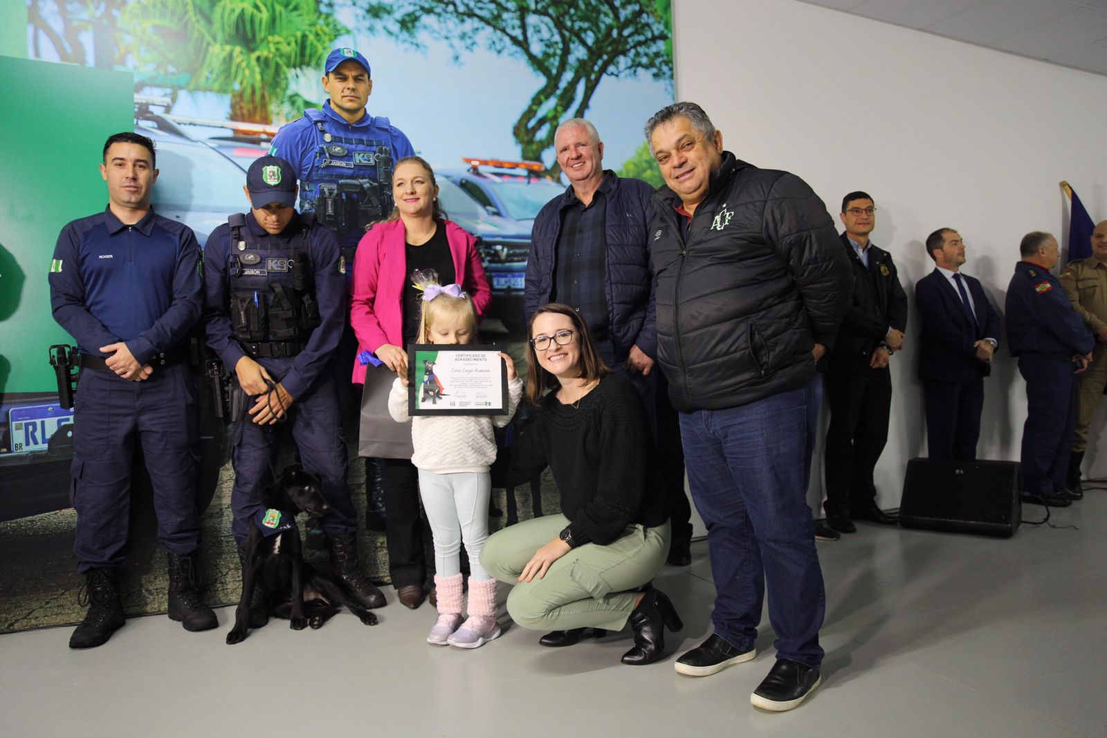 Durante a inauguração também foi revelado o vencedor do concurso para escolha do nome do novo integrante da Guarda Municipal, o cão labrador Luke. Entre os participantes da votação no site da Prefeitura e também no Shopping Pátio Chapecó, foi sorteada Lívia Luíza Asmann, que recebeu um presente da gerente geral do shopping, Tatiana Kerkhoff, além de um certificado da Diretoria de Segurança Pública.