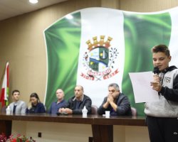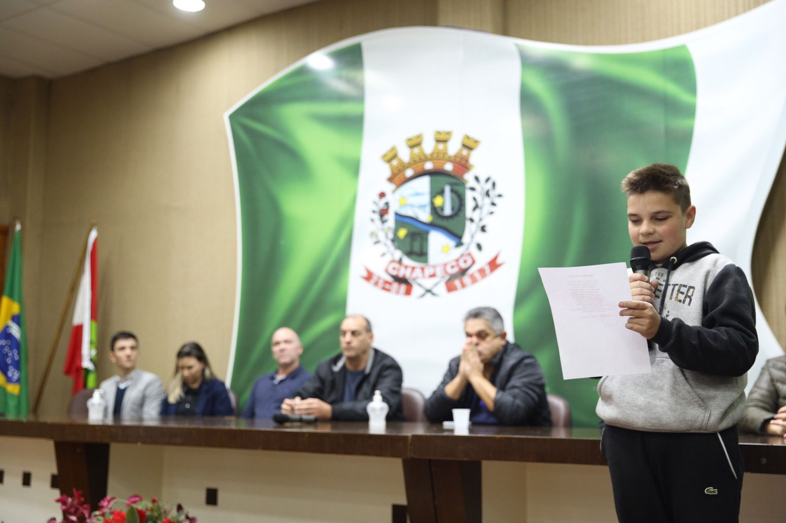 O aluno Luiz Fernando Strapazzon, do sétimo ano da EBM Florestan Fernandes, declamou uma poesia representando os alunos.