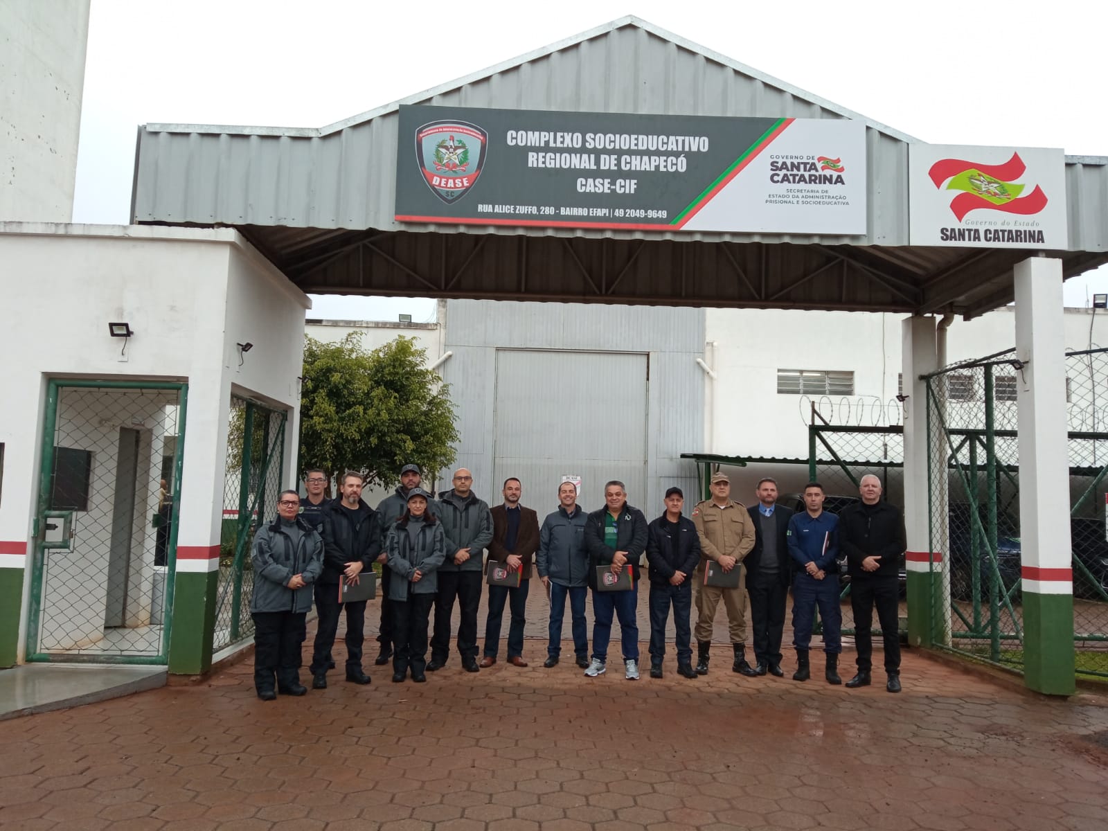 Eles foram recebidos pela Diretora Geral Adjunta do Departamento de Atendimento Socieducativo (DEASE), Simone Rocha da Silva, o Superintendente Regional Oeste da Polícia Penal, Alecsandro Zani, o Superintendente de Segurança do DEASE, Juliano Peres Pires, a Superintendente Psicossocial e de Saúde do DEASE, Cristiane Eller, o Superintendente Regional OESTE do DEASE, Matheus Rodrigues da Cruz, o Diretor do Complexo Socioeducativo Regional de Chapecó, Rudi Cleu de Oliveira Tormen, o chefe de Segurança do CASE, Gean Carlos Bernardi, o coordenador do Núcleo de Apoio Operacional, Moacir Guisolfi da Silva, e o coordenador do Grupo de Operações com Cães da Regional Oeste do DEASE, Marcelo Morona.