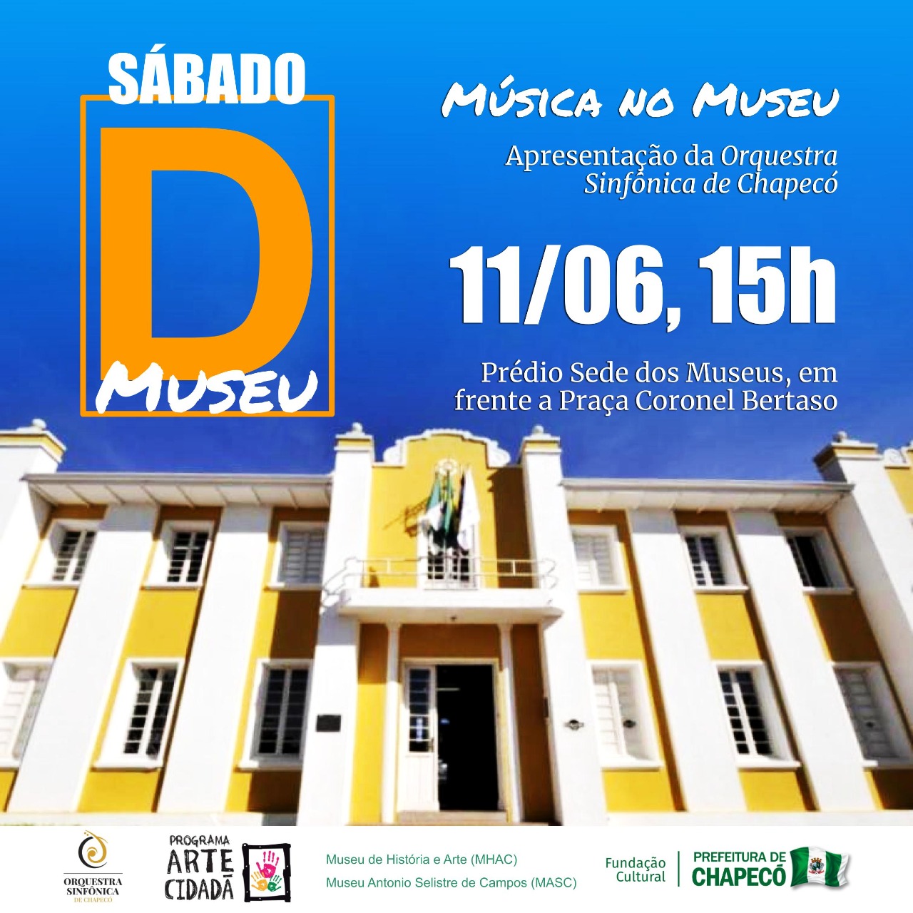 Ocorre, no próximo sábado (11), a partir das 15h, a segunda edição do Sábado D Museu em 2022, o Sábado D - Sinfonia no Museu. O evento, organizado pelo setor museológico da Fundação Cultural de Chapecó, receberá a Orquestra Sinfônica de Chapecó para um recital, além das exposições que ocorrem no Museu de História e Arte de Chapecó (MHAC) e no Museu Antônio Selistre de Campos (MASC).