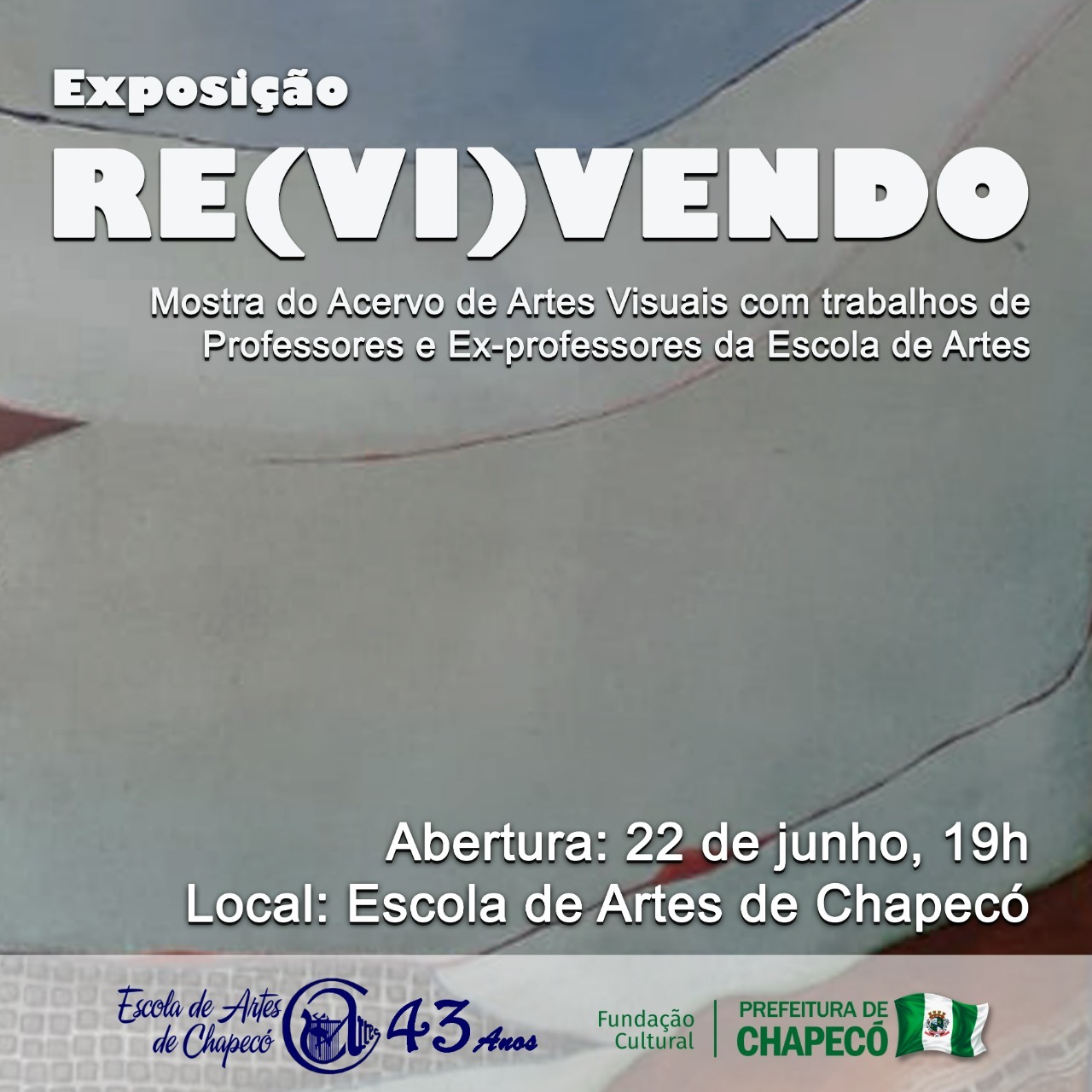 A Escola de Artes de Chapecó realiza, a partir do dia 22 de junho, a exposição RE(VI)VENDO. A mostra apresentará trabalhos de professores e ex-professores da Escola, e fará parte das comemorações de 43 anos da instituição, que são completados neste mês de junho. A abertura será às 19h, e seguirá recebendo visitantes até o dia 22 de agosto.