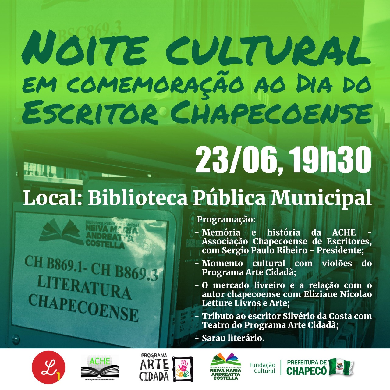 Nesta quinta-feira (23), às 19h30m, a Biblioteca Pública Municipal de Chapecó Neiva Maria Andreatta Costella realizará uma noite cultural em comemoração ao Dia do Escritor Chapecoense. Comemorado em 17 de junho, a data foi instituída através da Lei Nº 3.999/1999 e marca a fundação da Associação Chapecoense de Escritores (ACHE), entidade que reúne escritores e escritoras locais desde 1986.