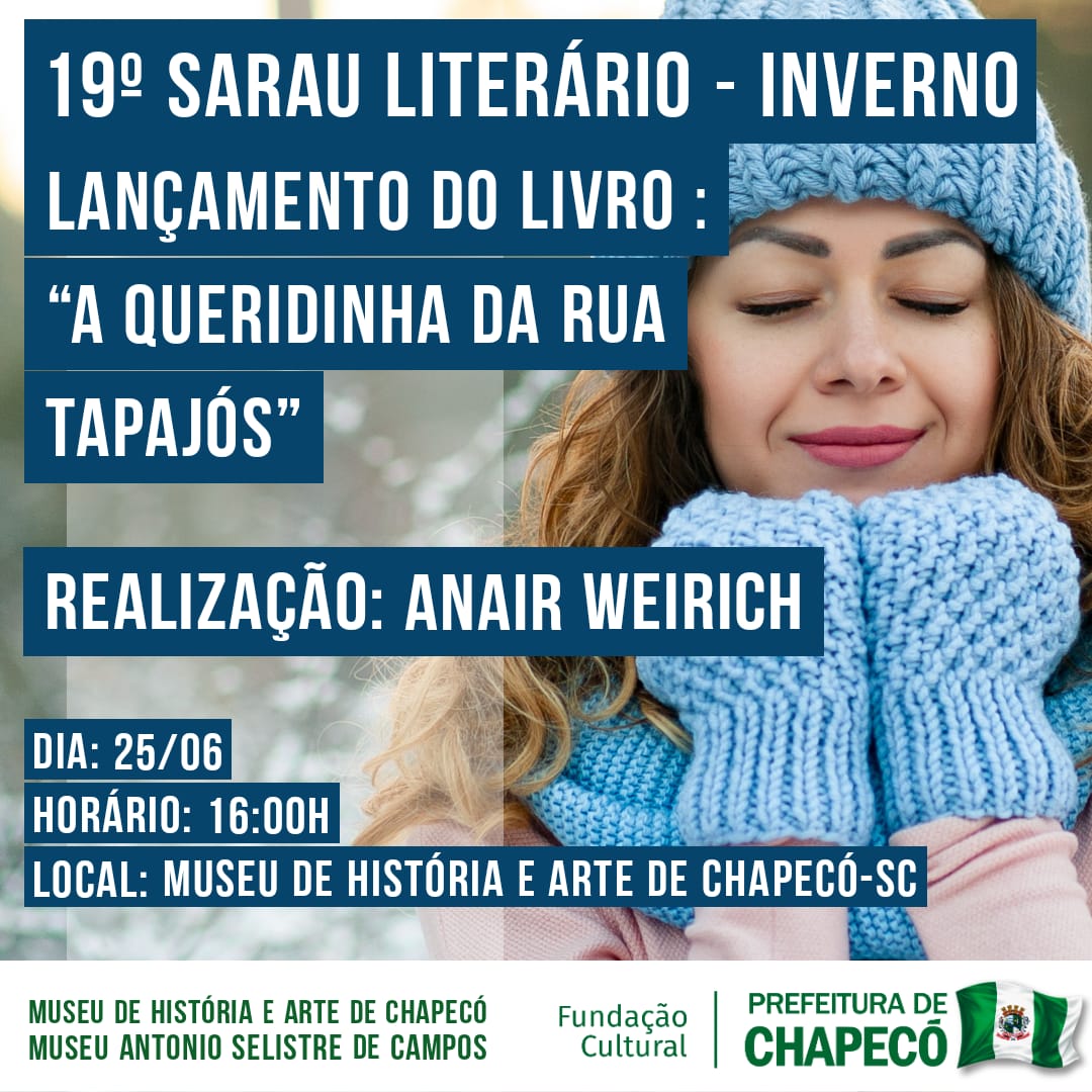 Ocorre, neste sábado (25), a partir das 16h, o Sarau das Estações - Inverno. O evento, promovido pelo Museu de História e Arte de Chapecó (MHAC) e o Museu Antonio Selistre de Campos (MASC), é alusivo ao Dia do Escritor Chapecoense - que é celebrado no dia 17 de junho - e contará com o lançamento do livro A Queridinha da Rua Tapajós, da escritora chapecoense Anair Weirich.