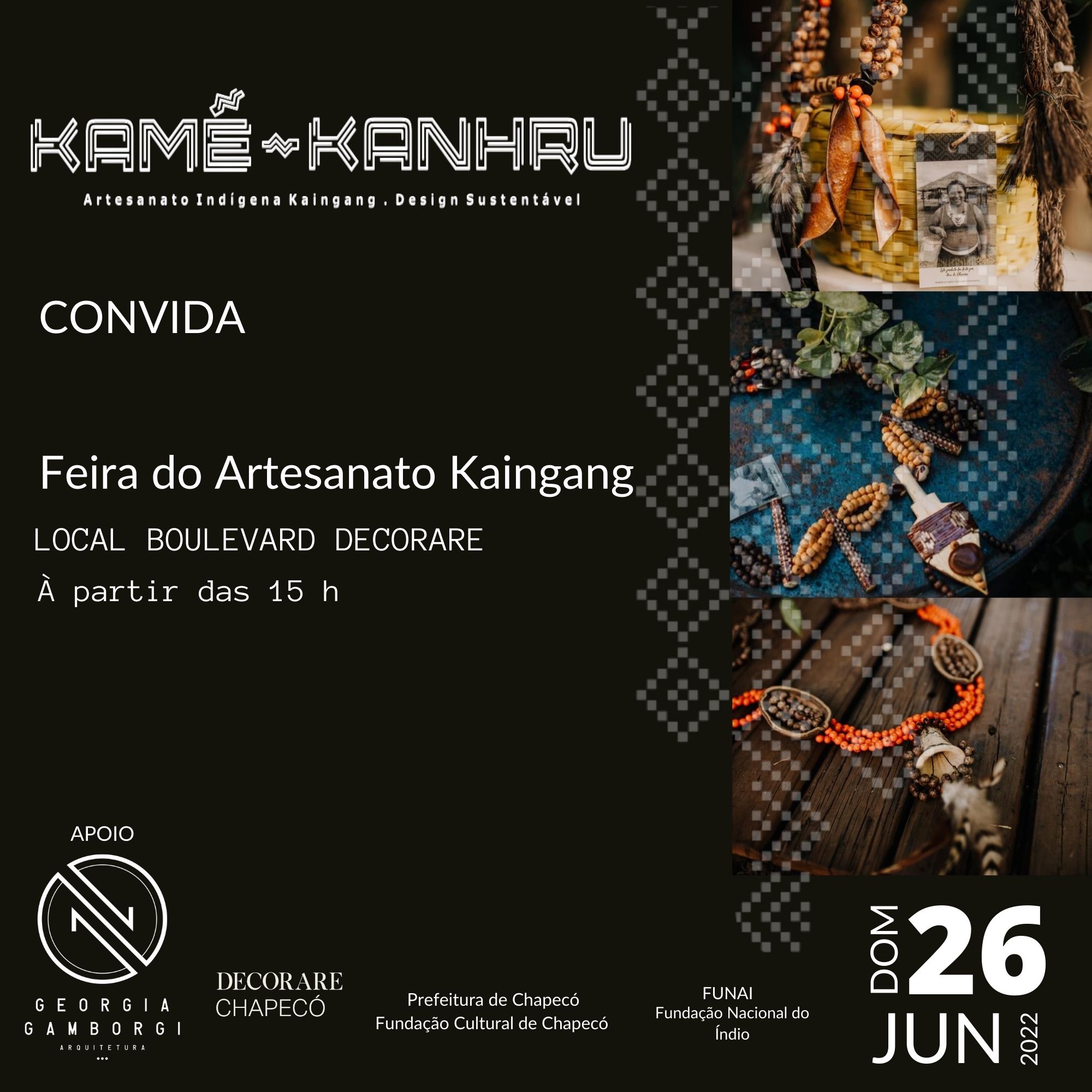 A programação da Decorare Chapecó no próximo domingo (26) contará com a presença da Feira do Artesanato Kaingang. A partir das 15h, no Espaço Boulevard da arquiteta Georgia Gamborghi, artistas indígenas da Associação Kaingang Kamé Kanhru irão expor e comercializar peças de cestaria, adornos, colares de parede e mesa, peneiras, entre outros produtos que retratam as culturas dos povos originários do Oeste Catarinense.