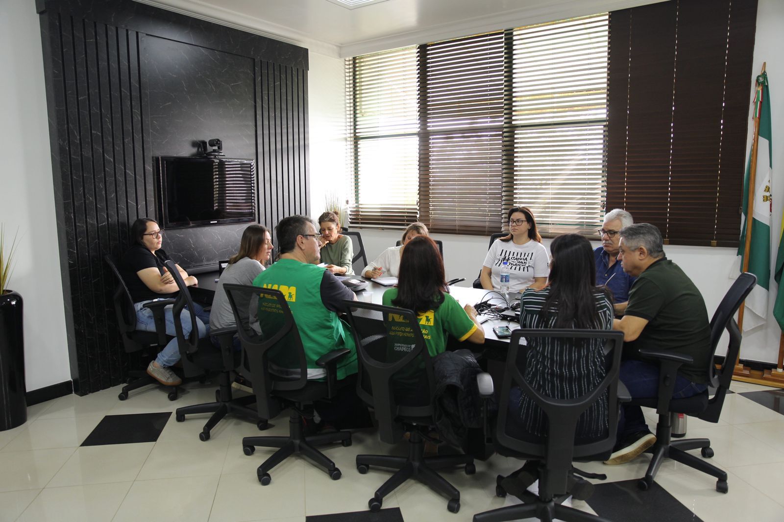 A reunião foi no gabinete do prefeito. Estiveram presentes representantes das ONGs Amparo Animal, Proteção Animal Chapecó, Mais Vira-Lata Chapecó, Voluntários Amigos dos Bichos e Cão Cidadão.