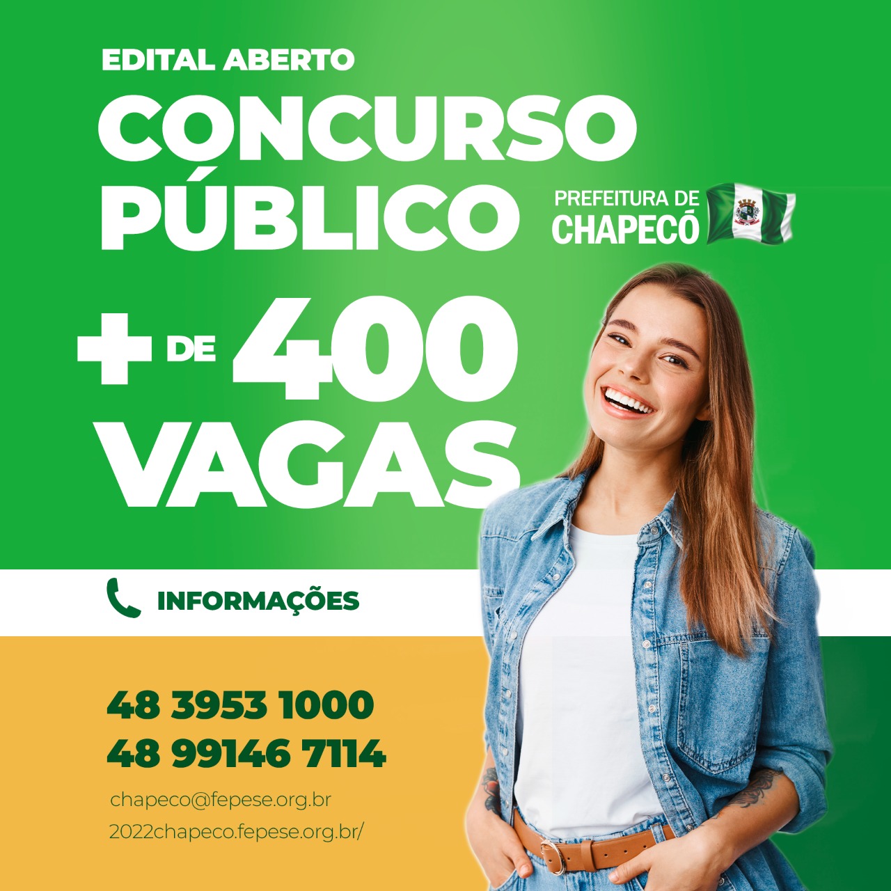 Encerra nesta segunda-feira o prazo das inscrições para o Concurso Público da Prefeitura de Chapecó. São 432 vagas, sendo 163 para Ensino Superior, 145 para Ensino Médio e 124 para Ensino Fundamental. A inscrição deve ser feita no site da FEPESE (http://2022chapeco.fepese.org.br). Os editais também constam no site da Prefeitura de Chapecó (www.chapeco.sc.gov.br).