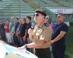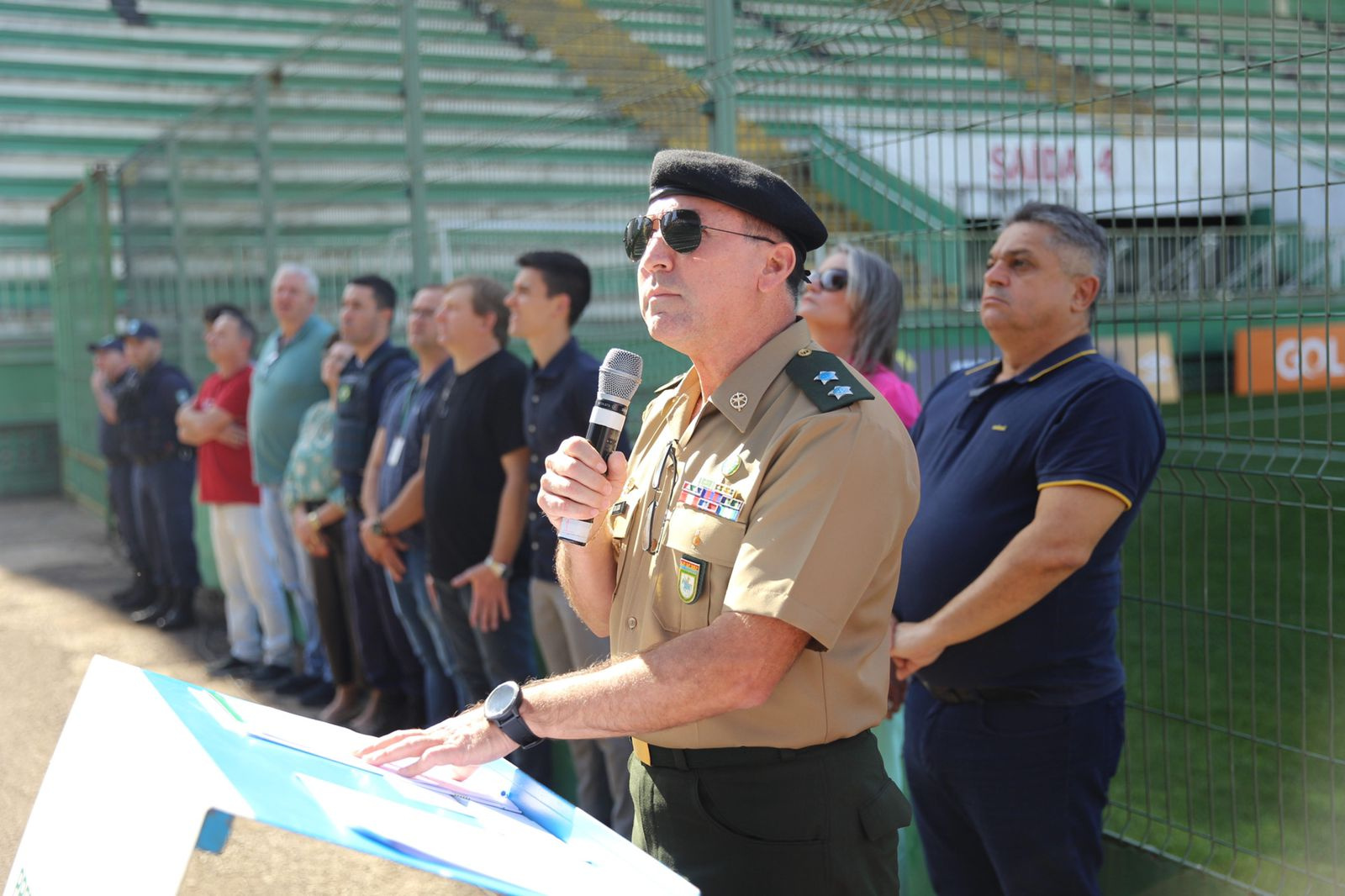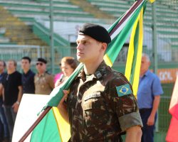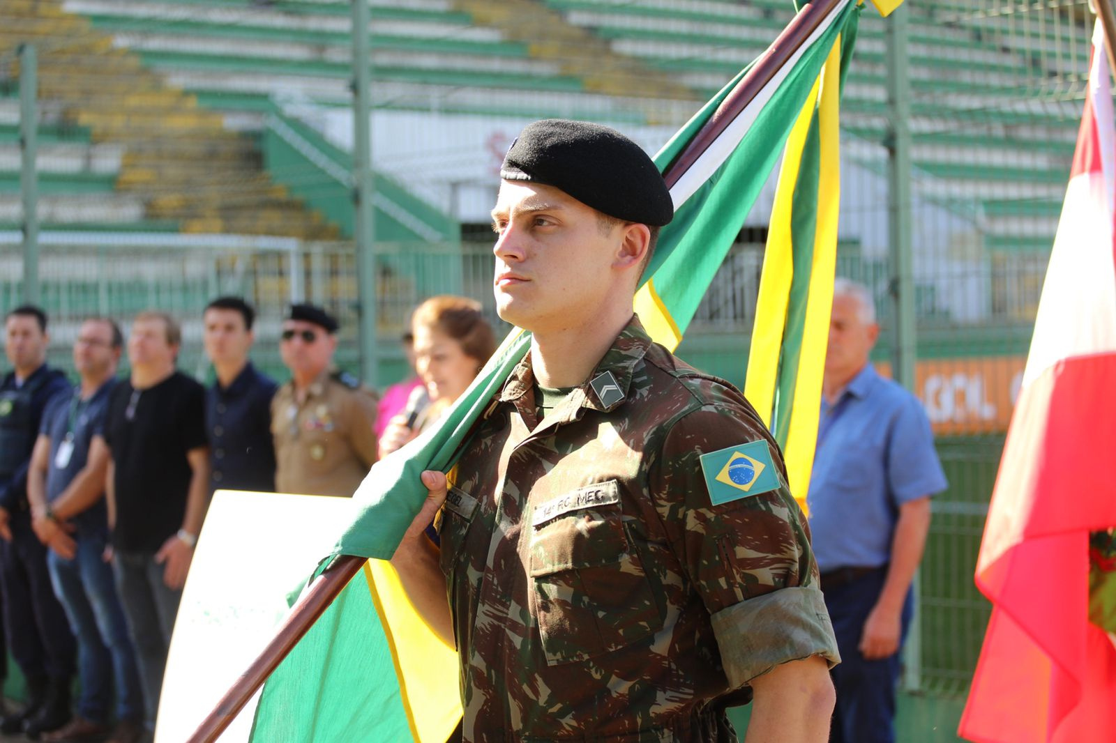 O prefeito de Chapecó, João Rodrigues, participou no início da tarde desta terça-feira da cerimônia de juramento à Bandeira, na Arena Condá. A solenidade marcou a entrega de Certificado de Dispensa de Incorporação aos dispensados do Serviço Militar. Estiveram presentes cerca de 300 jovens. O chefe do posto de recrutamento e mobilização de São Miguel do Oeste, 1o tenente Sandro Rogério Mendes Lucas, falou em nome do Exército. Em São Miguel do Oeste fica o 14o Regimento de Cavalaria Mecanizada, que é a unidade do Exército na região de Fronteira, de Santa Catarina com a Argentina. Também estiveram presentes o diretor de Segurança Pública, Clovis Ari Leuze, o comandante da Guarda Municipal de Chapecó, Roger Natan de Lima, a secretária da Junta Militar de Chapecó, Maria Fernanda Becker, o vice-presidente da Câmara de Vereadores de Chapecó, Nelson Krombauer, além de outros vereadores.