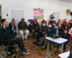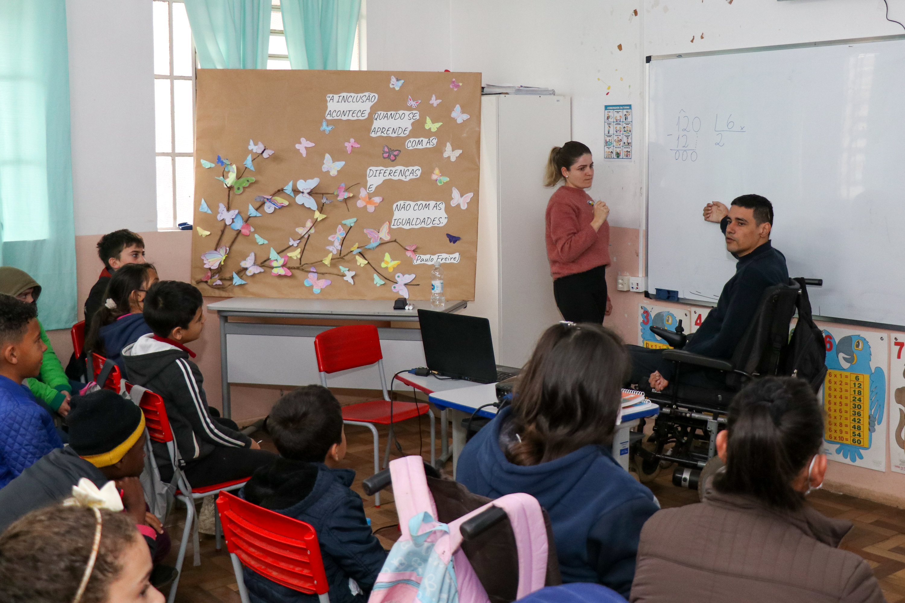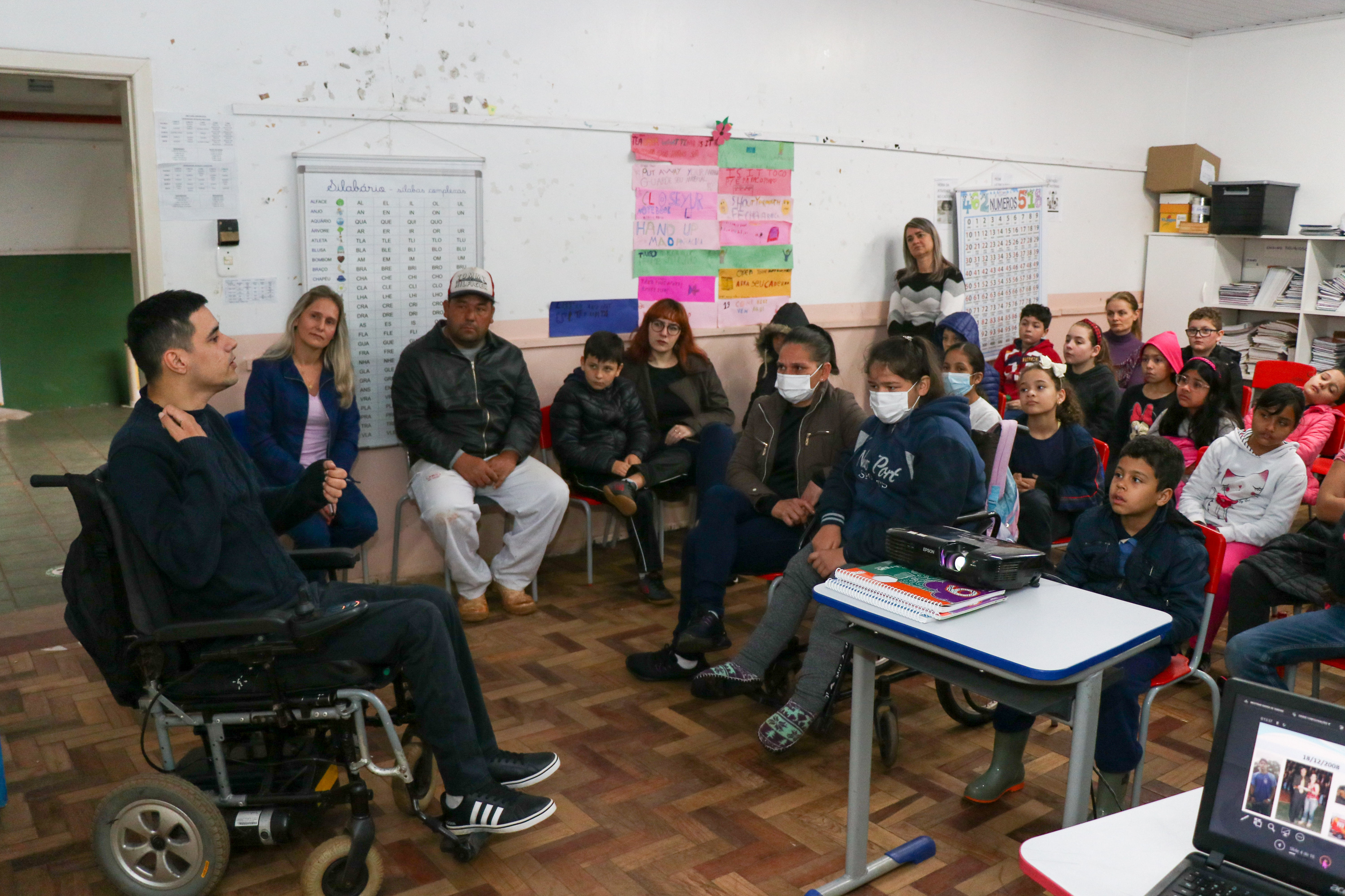 Neste primeiro momento, as turmas do 4º ano participaram de duas atividades, sendo a primeira, uma palestra com o professor da Rede Municipal Ensino, Paulo Cesar Martins. Ele contou um pouco da sua história de superação, os desafios que enfrenta no dia a dia e como é ser um professor de matemática e cadeirante. Em sua fala, incentivou os alunos a buscarem seus sonhos e sempre acreditarem em suas potencialidades.